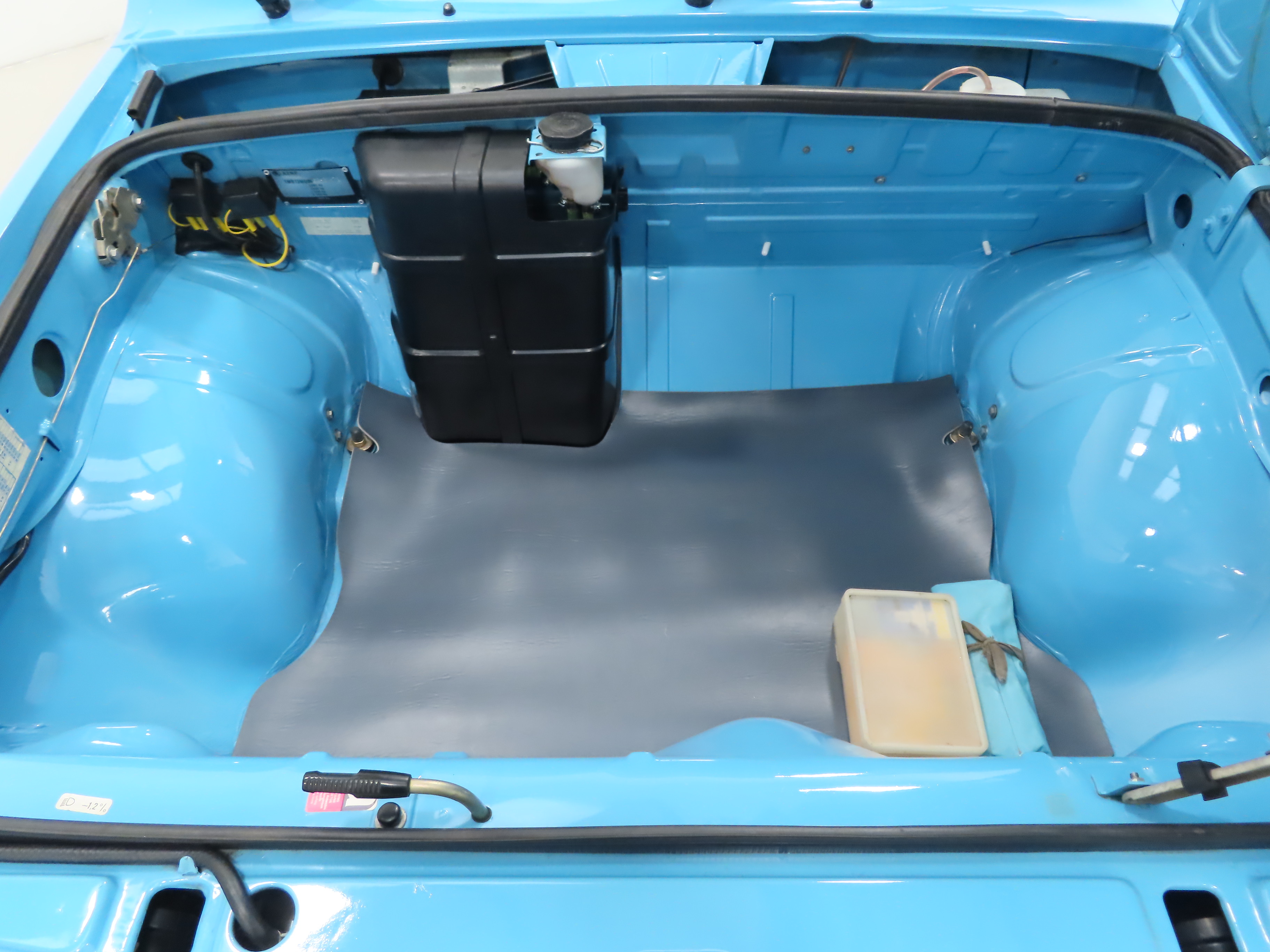 A preserved incredibly sturdy and utilitarian interior, exactly as intended. The surprisingly plush black seat fabric with vinyl side seat trim remains in pristine condition and entirely commensurate with the miniscule mileage. The black vinyl door cards are fully intact and still wear undamaged door pockets which were standard on the elaborate 130L. The carpets, more akin to sandpaper, exude durability over opulence are exactly as they left the factory and remain protected by the original sturdy Skoda tray mats. Totally untouched even down to the dot labels on seat-belt buckles, supplying dealer tax disc holder, gear shift diagram sticker, rear door chrome child lock stickers and even the ultra-rare factory identification code affixed to the rear-view mirror, usually removed upon PDI. The huge front luggage compartment with quirky side hinged hood is spotless and still has the protective mat, spare bulb kit and tool roll as well as bulkhead chassis stamp, VIN plate, AZNP build plate and delicate labels. A well-appointed interior in a car that at the time was offered hundreds of pounds cheaper than other saloons with similar specification!
