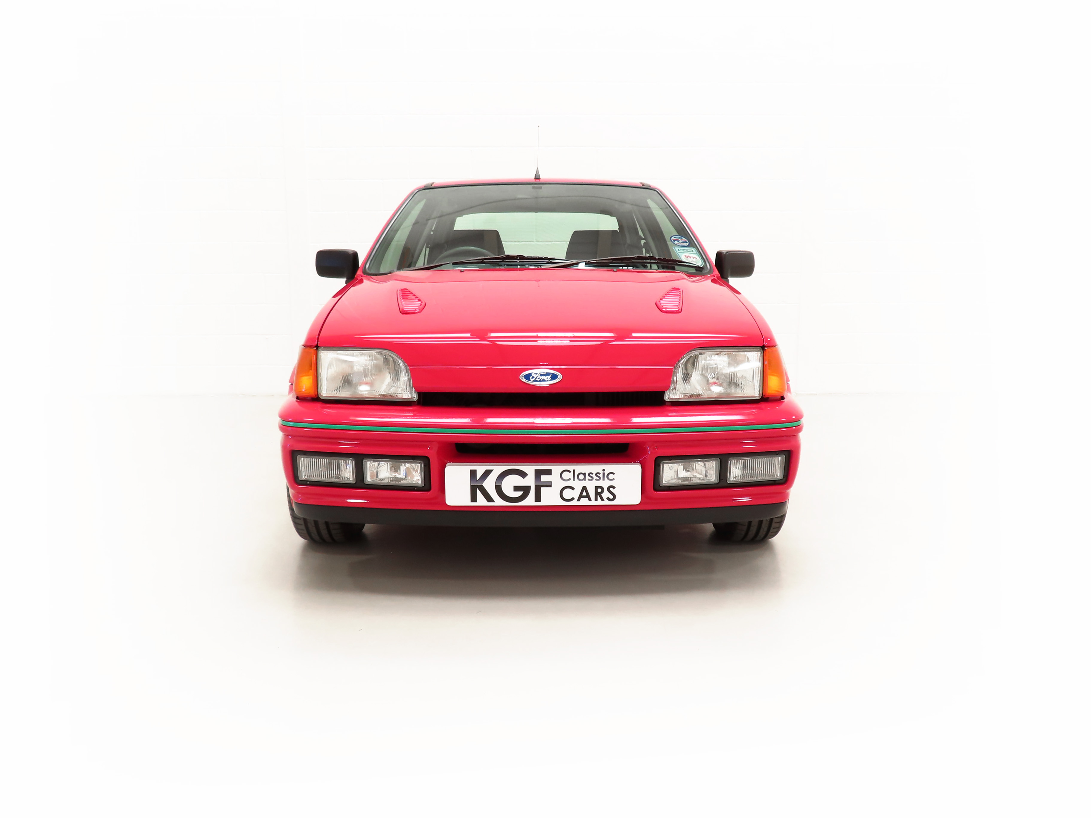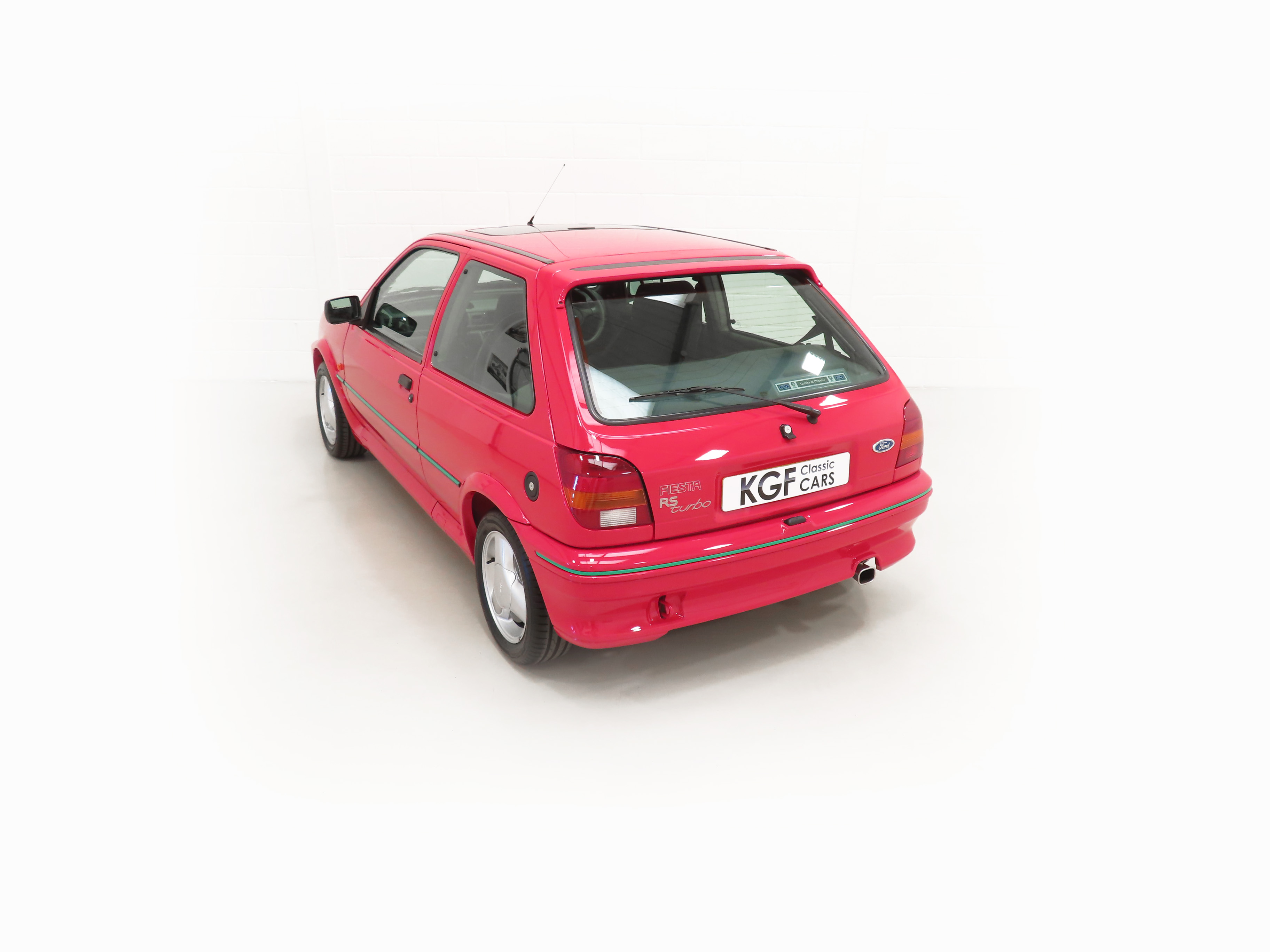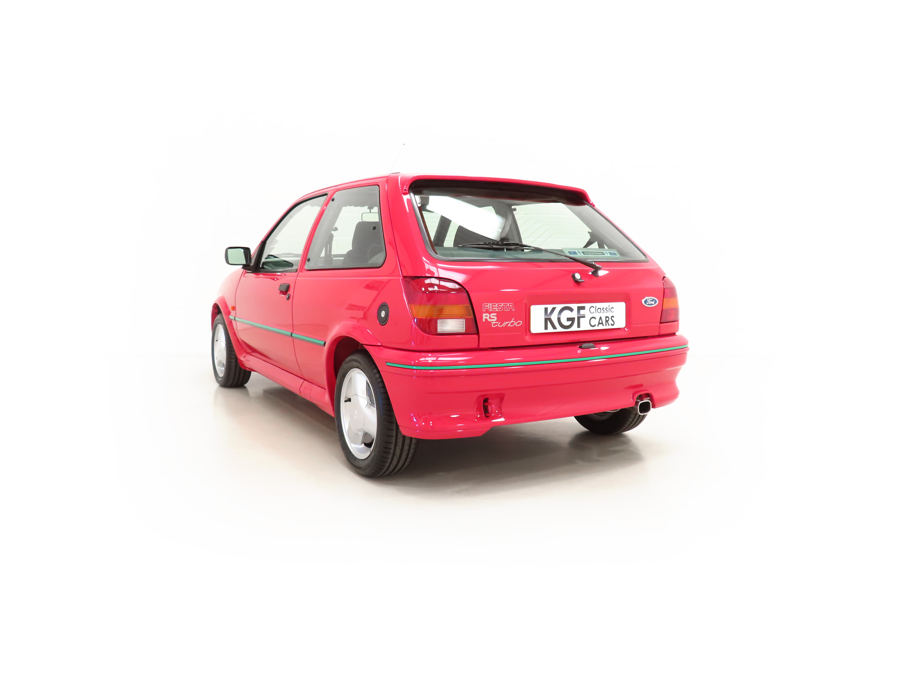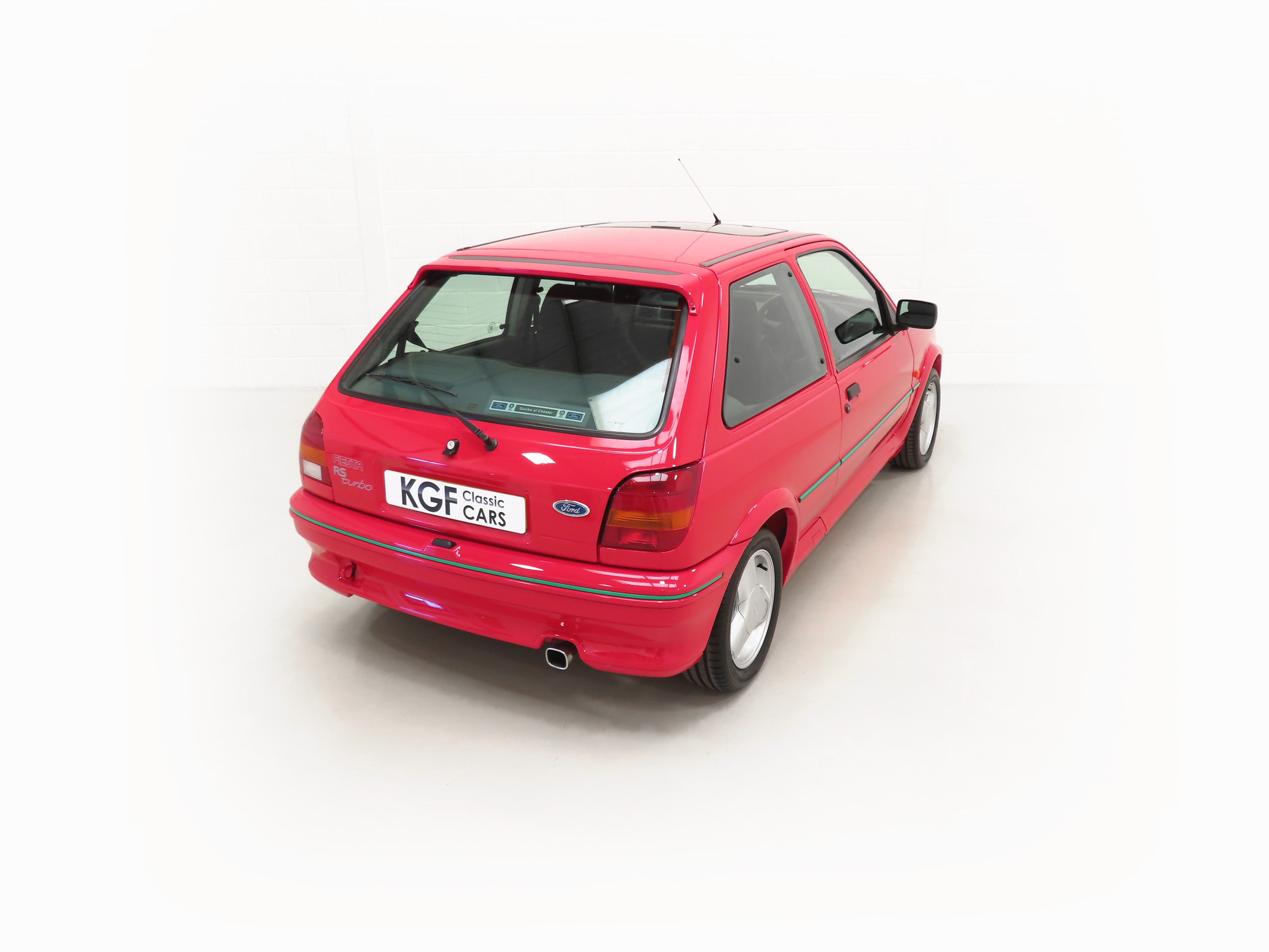 Finished in lustrous Ford Radiant Red, (Code P1), this incredible example has an amazing deep gloss shine preserved from years of enthusiast ownership and careful storage. All the trim and rubbers are as new and reflect the uber low mileage. All Ford glass is chassis etched and the Valeo and Hella lights are correct fitment. There is a small touched-in mark to the front bumper corner. The factory decals and vibrant green insert remain in pristine condition and supplying Ford main dealer number plates, rear screen sticker and tax disc holder remain fitted. The performance character is clearly expressed in the styling and those enjoying the concours show circuit will appreciate the factory fresh underside and spotlessly clean wheel arch apertures. Suitable for the most discerning and fastidious collector seeking a totally unmolested and very rare Fiesta RS Turbo. Surely the best?