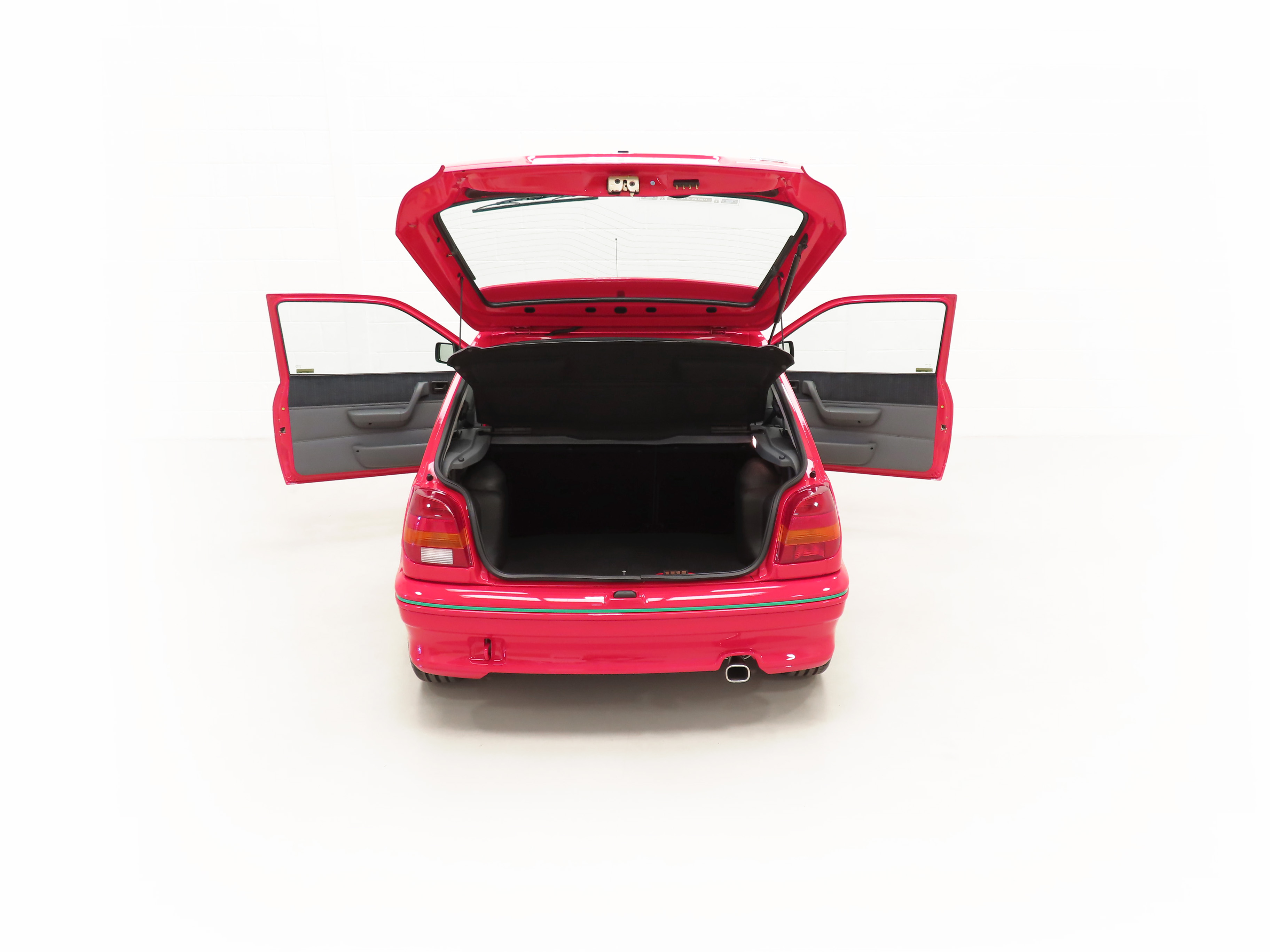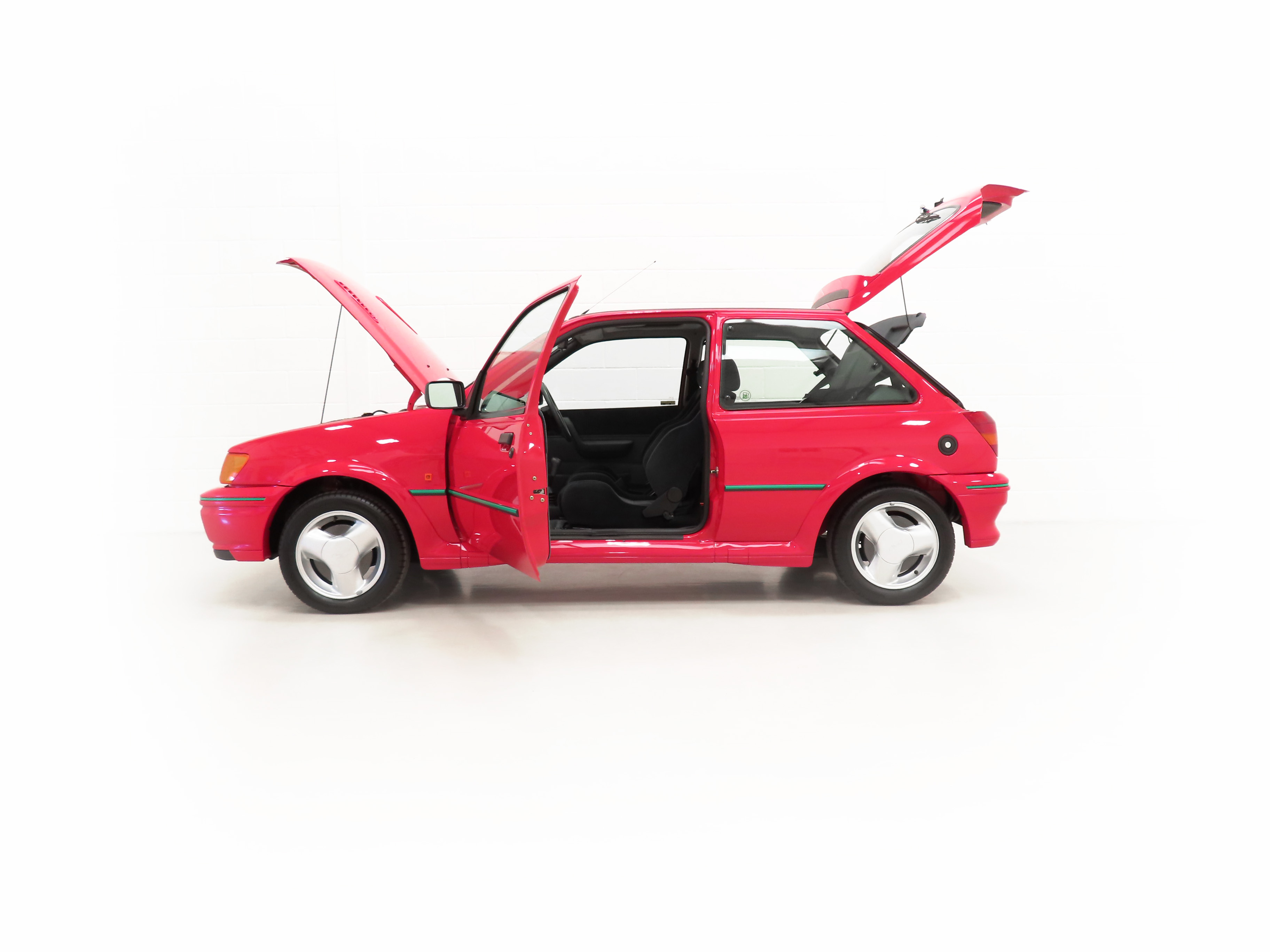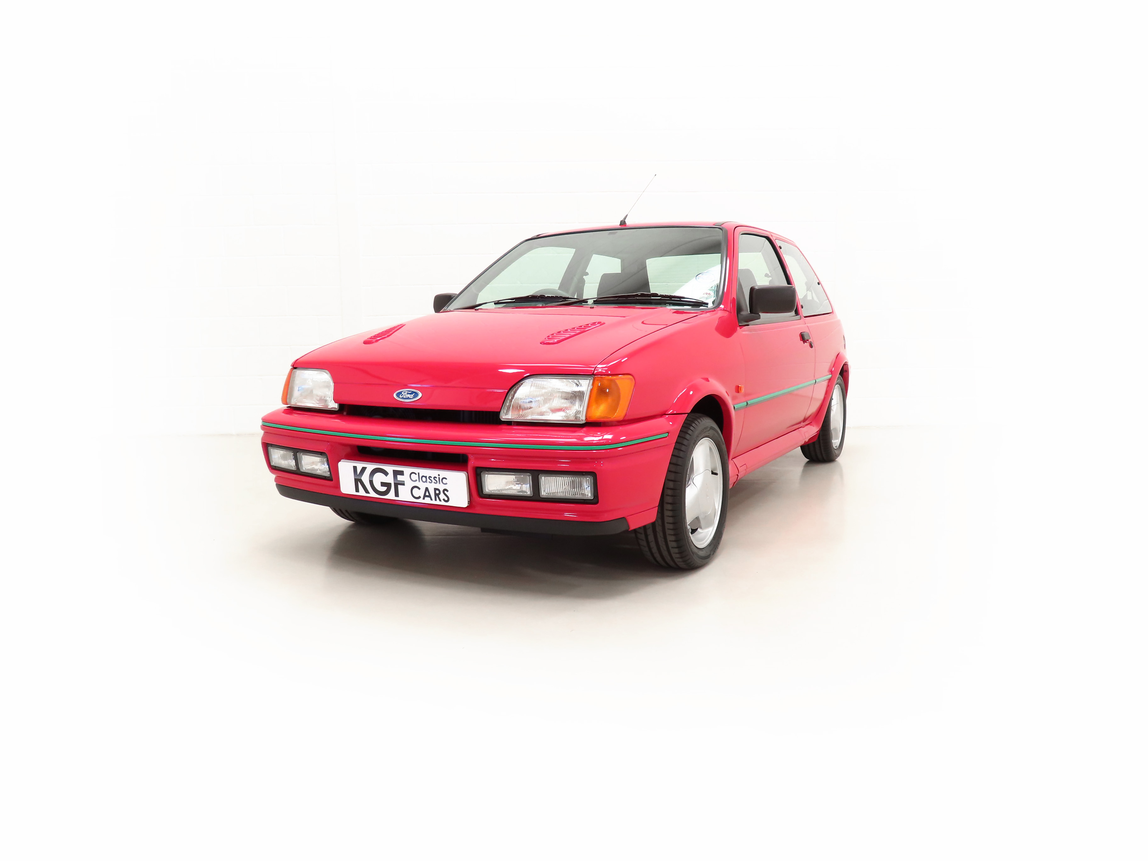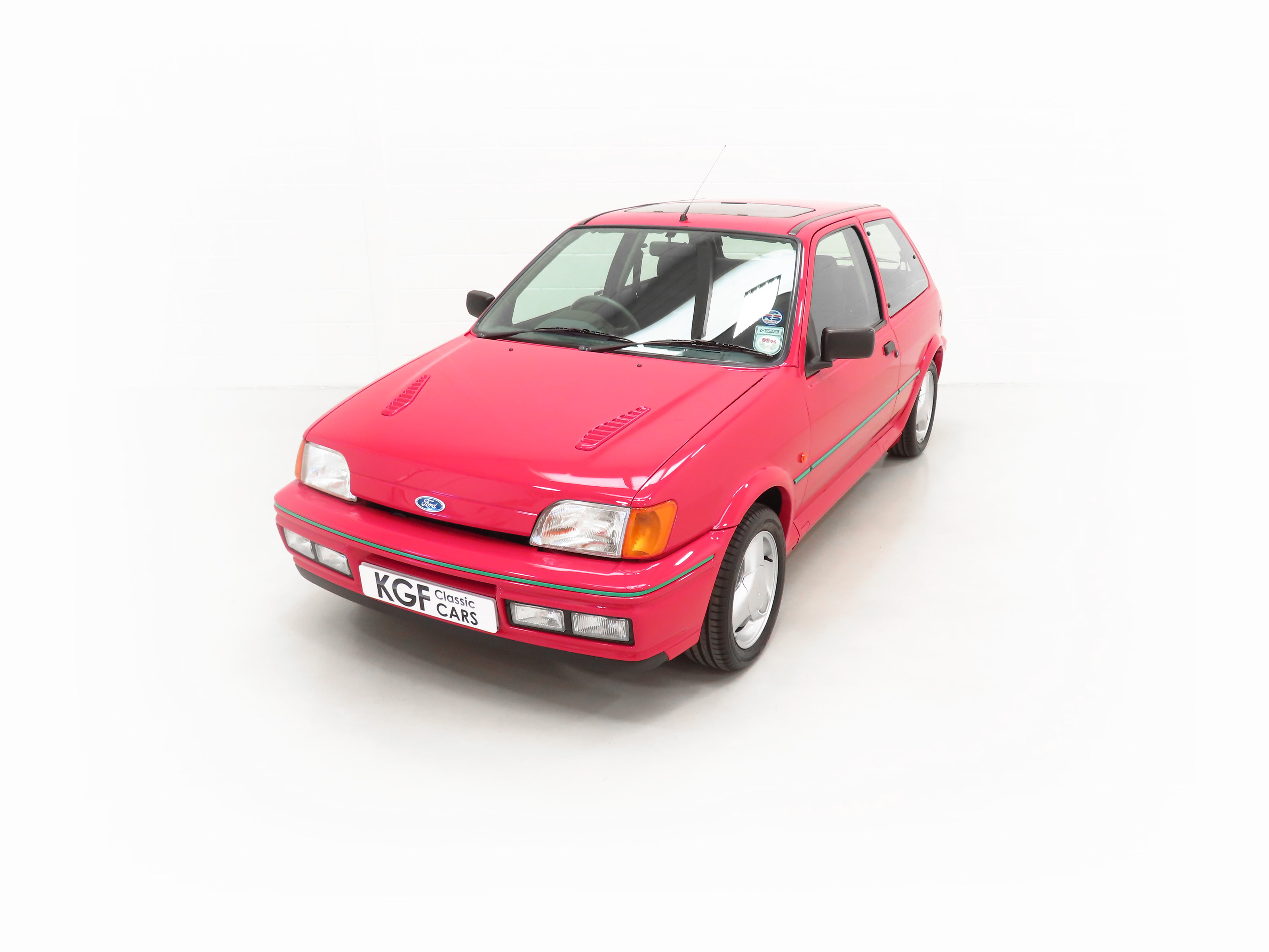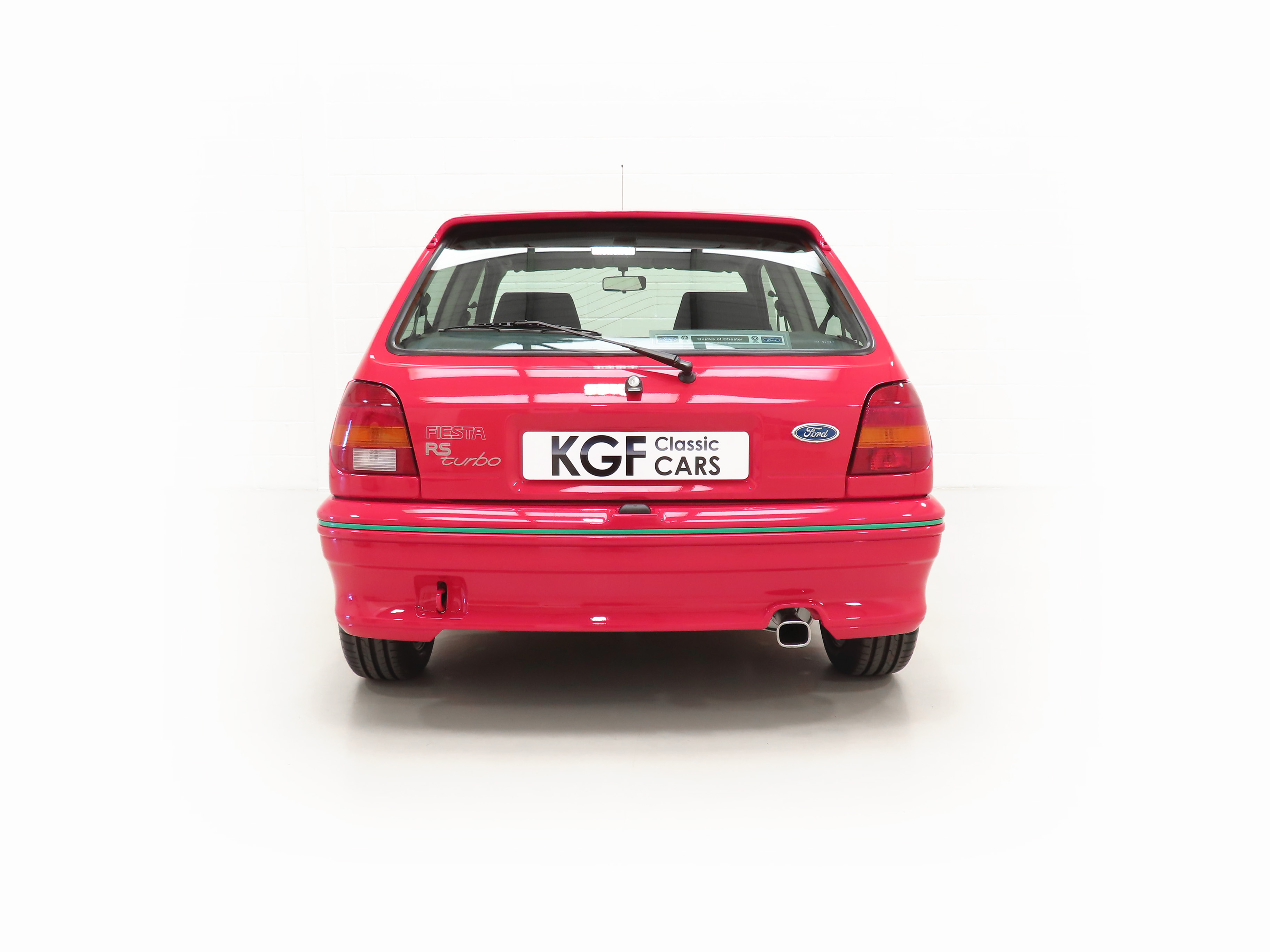 Finished in lustrous Ford Radiant Red, (Code P1), this incredible example has an amazing deep gloss shine preserved from years of enthusiast ownership and careful storage. All the trim and rubbers are as new and reflect the uber low mileage. All Ford glass is chassis etched and the Valeo and Hella lights are correct fitment. There is a small touched-in mark to the front bumper corner. The factory decals and vibrant green insert remain in pristine condition and supplying Ford main dealer number plates, rear screen sticker and tax disc holder remain fitted. The performance character is clearly expressed in the styling and those enjoying the concours show circuit will appreciate the factory fresh underside and spotlessly clean wheel arch apertures. Suitable for the most discerning and fastidious collector seeking a totally unmolested and very rare Fiesta RS Turbo. Surely the best?