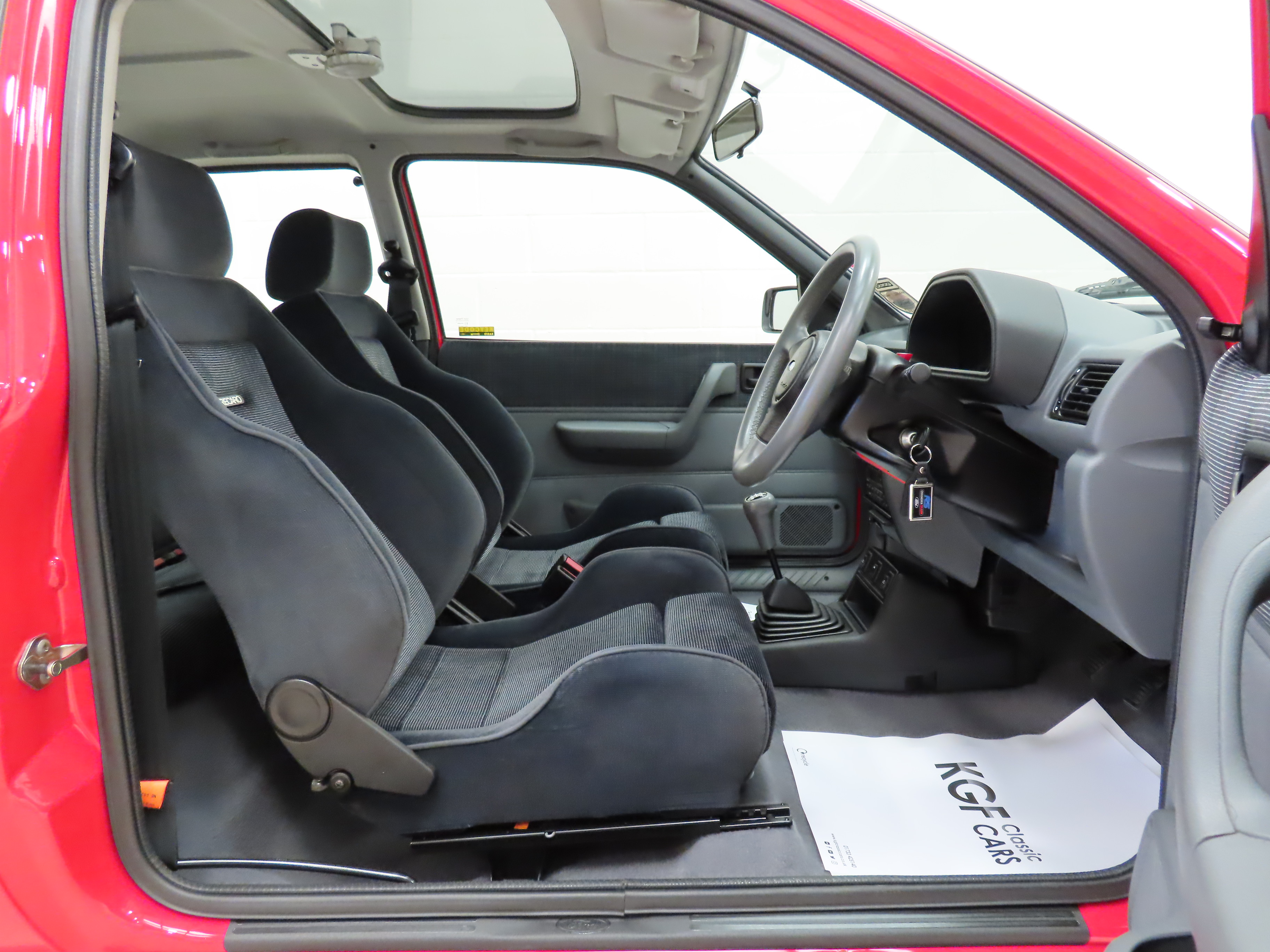 The 1.6 OHC fuel injected engine with Garrett AiResearch T2 turbo charger and intercooler produces 131bhp and 183Nm of torque. Figures are quoted at 7.7 seconds to 60mph and a top speed of 127mph to make this a true ‘hot hatch’. The engine bay is simply incredible with vibrant coloured plastics, clips, hoses and fasteners all standard. Delicate Ford labels, warning stickers and even the Ford red ignition leads remain fitted. The often misplaced plastic battery cover remains attached. The 5-speed transmission works seamlessly with a progressive clutch action and short shift.