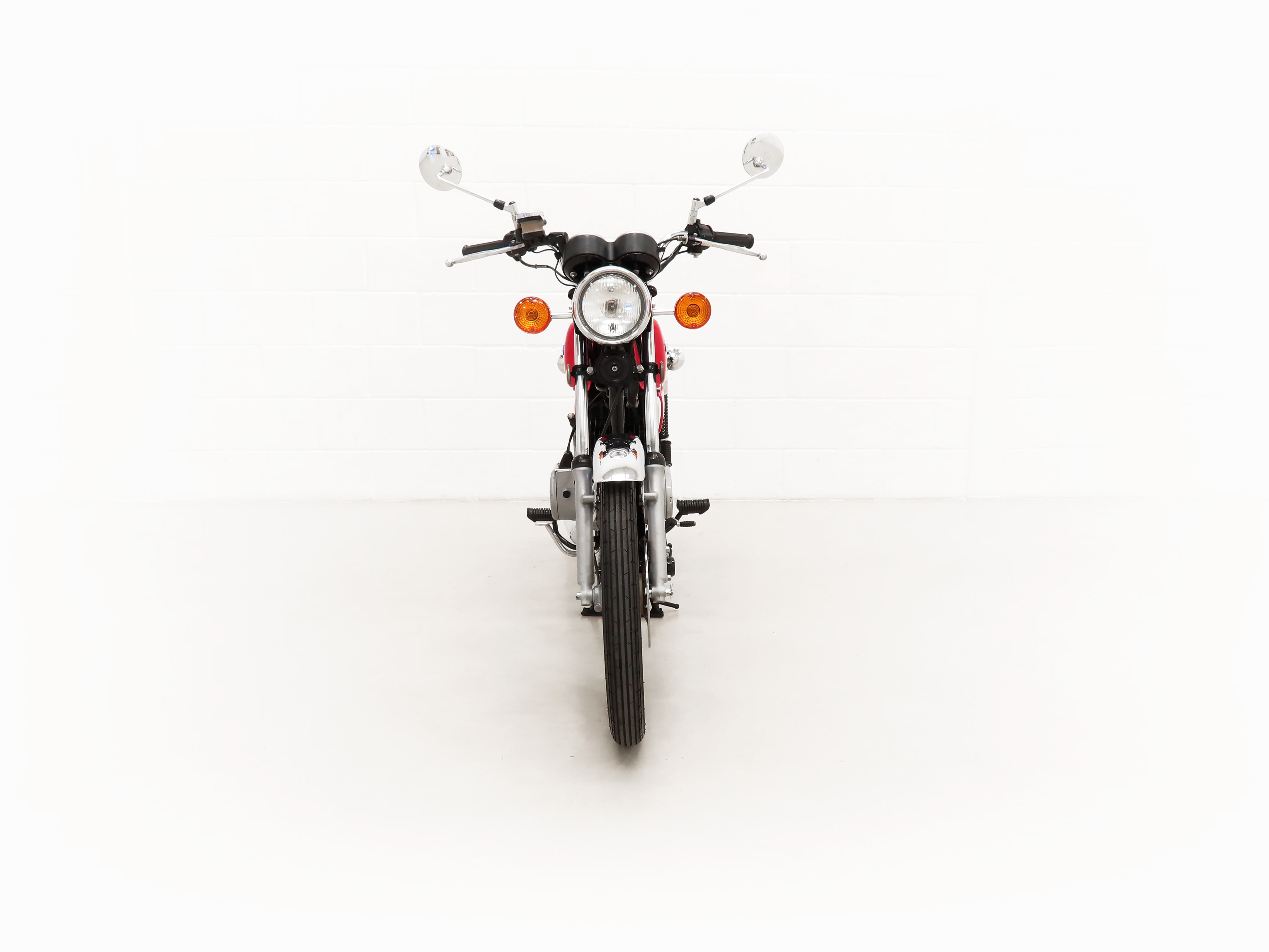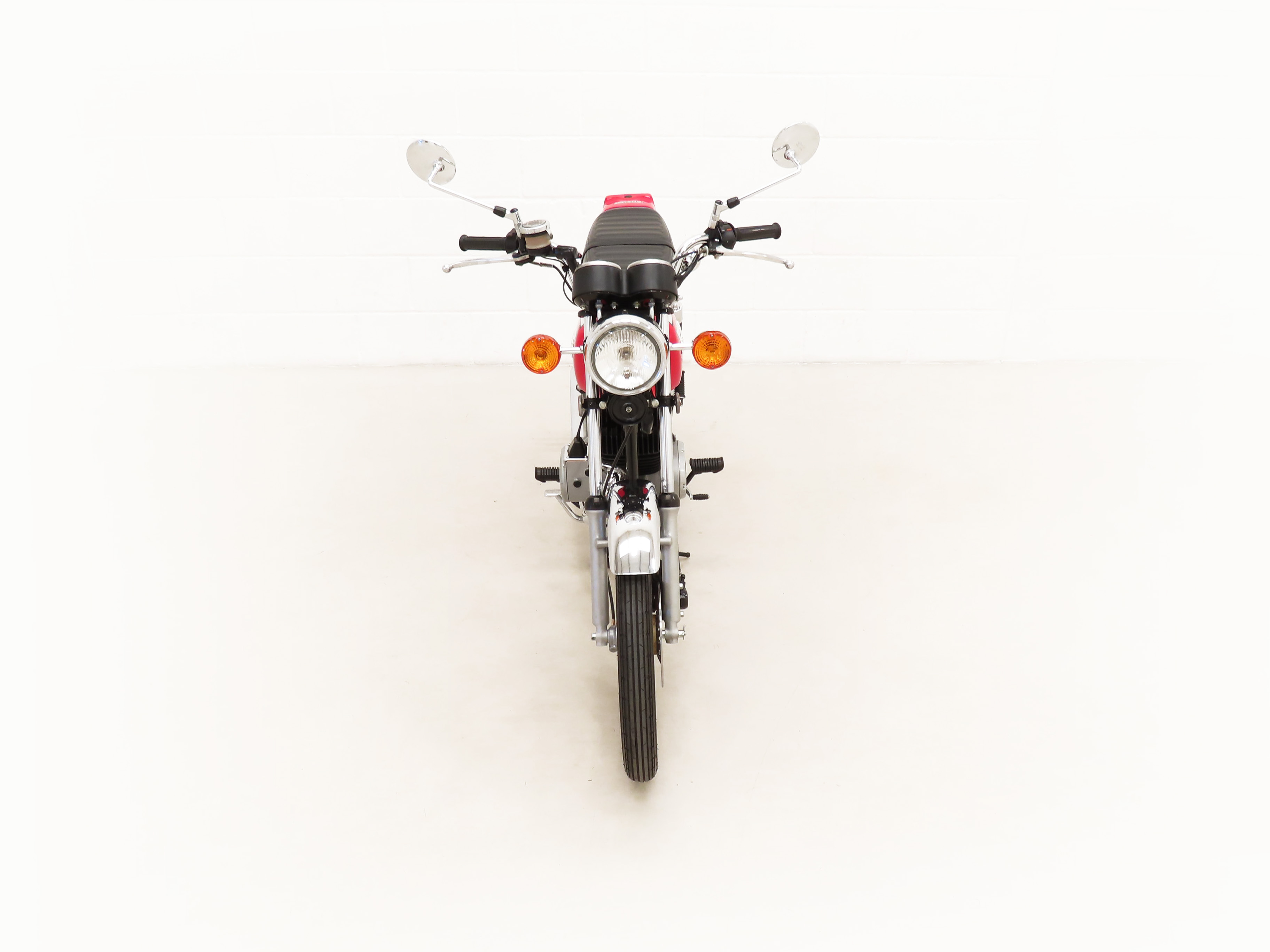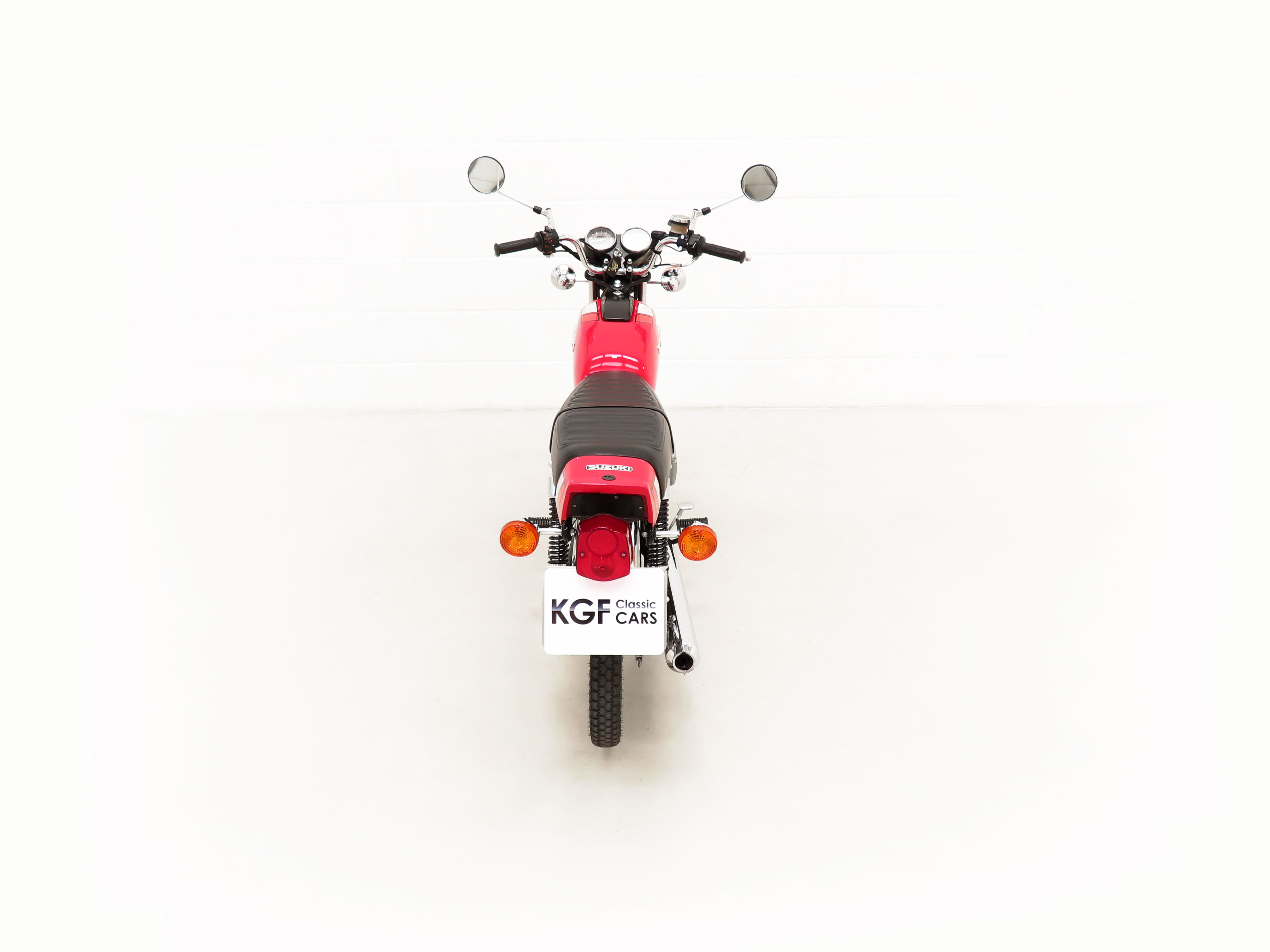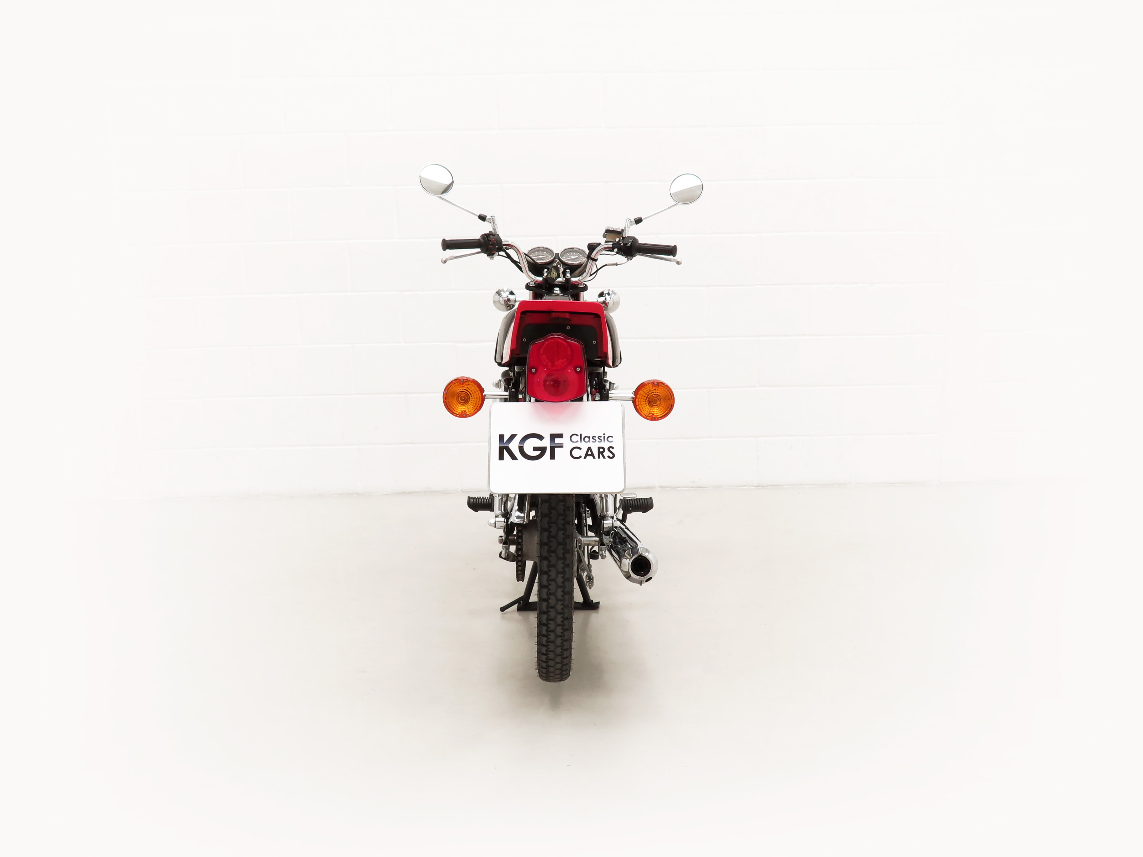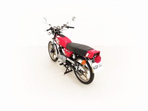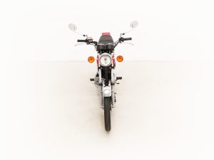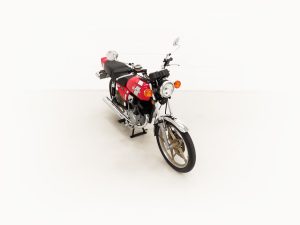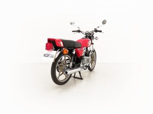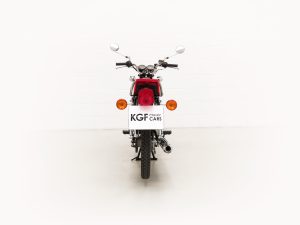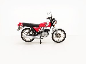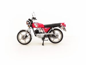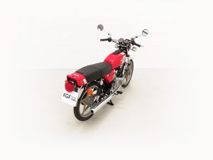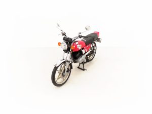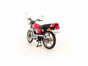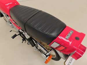 Most bikes of this class were commuter machines, but the GP100 was more akin to a real motorcycle of the era with the looks and performance without the insurance premiums. Being the sportier model and finished in gloss Red it looks fabulous with period decals and badges in bright excellent condition. All the chrome has a mirror finish and the original Suzuki exhaust pipe is pristine with the part number clearly visible. The front mudguard has some minor dings, and the large size speedometer and tachometer is fully operational along with the warning lights. The original Stanley headlamp is clear, and the matching numbers frame ID is still encased in the protection sticker. A fabulous piece of Yamaha two-stroke history and a real hot 100!