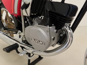 Being the sportier model, this example is fitted with the rare and genuine Suzuki mag wheels with Gold inner and polished Silver outer edging. Having never been refurbished there is some minor tarnishing, and they are shod in branded 2.75-18 rear and 2.50-18 front tyres with ample tread. Factory upgraded from the usual drum front brake, a desirable front hydraulic disc brake ensures positive stopping power at high speeds or under rainy conditions alike.