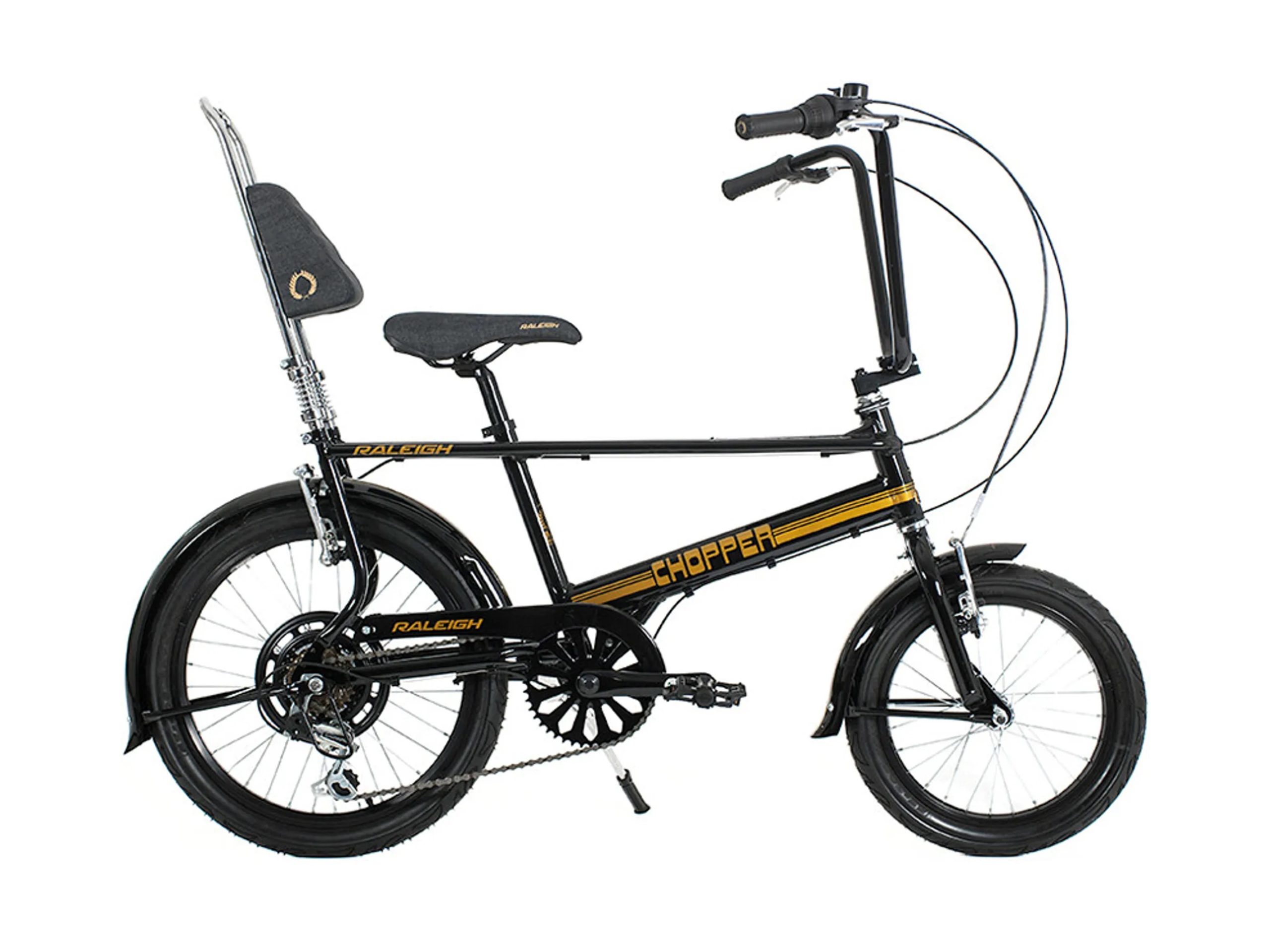 The Raleigh Chopper, although an icon of the 1970’s and where it saw the majority of its phenomenal success, was first launched in 1969 by the Raleigh Bicycle Company in Nottingham, England. The bikes design was influenced by dragsters, chopped motorcycles and beach buggies and it quickly became a cultural icon, especially among young people. Throughout the evolution of the Chopper from the Mark 1 to the Mark 4, the essence of the design has changed very little, but certain safety flaws linked to the Mark 1 and 2 had to be overcome following negative press in the 1970’s where it was in some cases labelled as a dangerous toy! These included the tendency for the bike to perform involuntary ‘wheelies’ particularly when giving a friend a ‘backie’ on the long padded high-back seat and also the groin catching T-Bar frame mounted gear lever. Thankfully after an absence of over 20 years saw the Mark 3 relaunch with a more conventional seat to deter the offering of ‘backies’ and re-siting of the gear lever to the handlebar, a more personal equipment friendly location! Original Choppers have gained a highly collectable status and soaring prices with the limited-edition releases now extremely sought after.