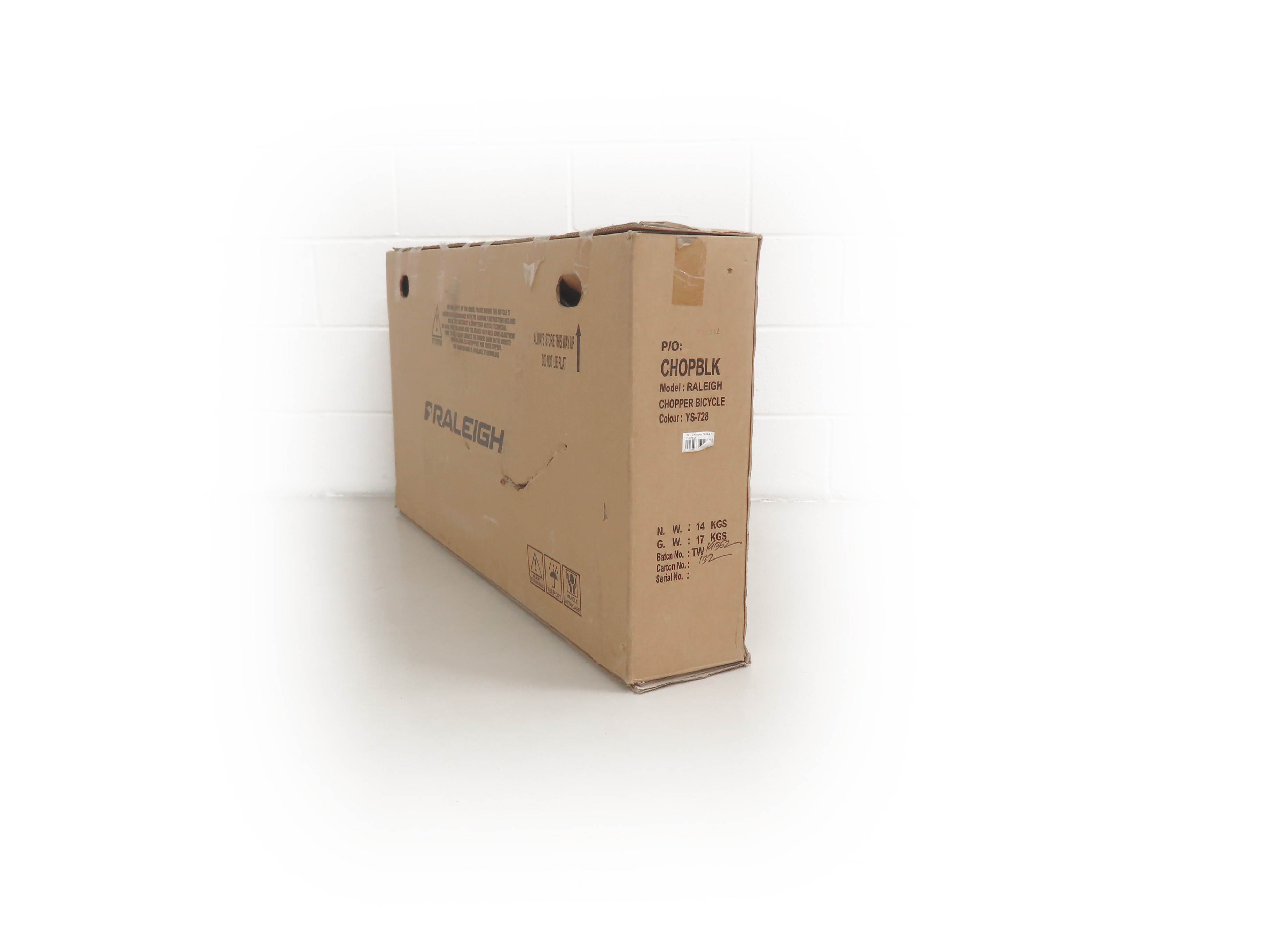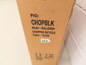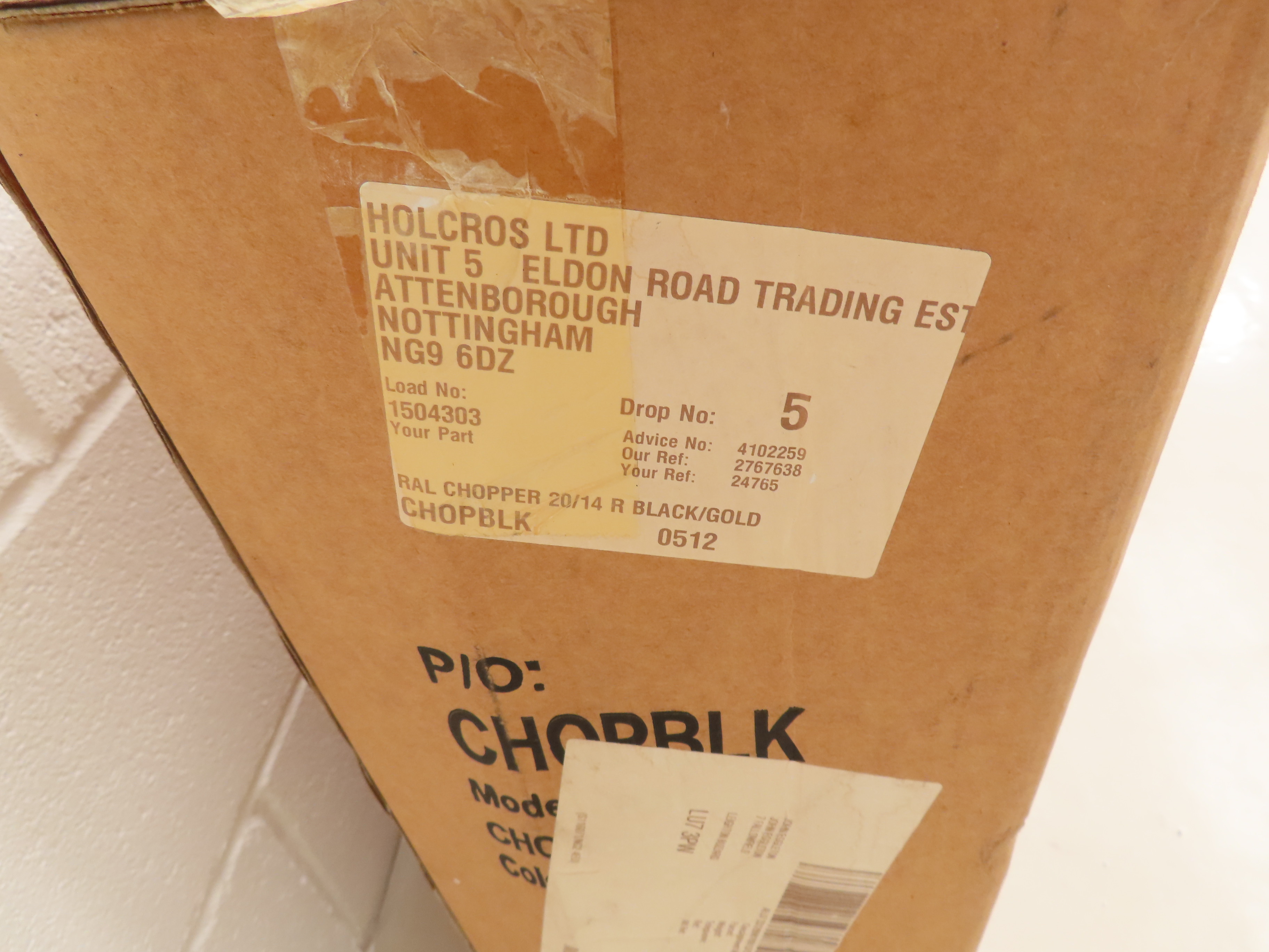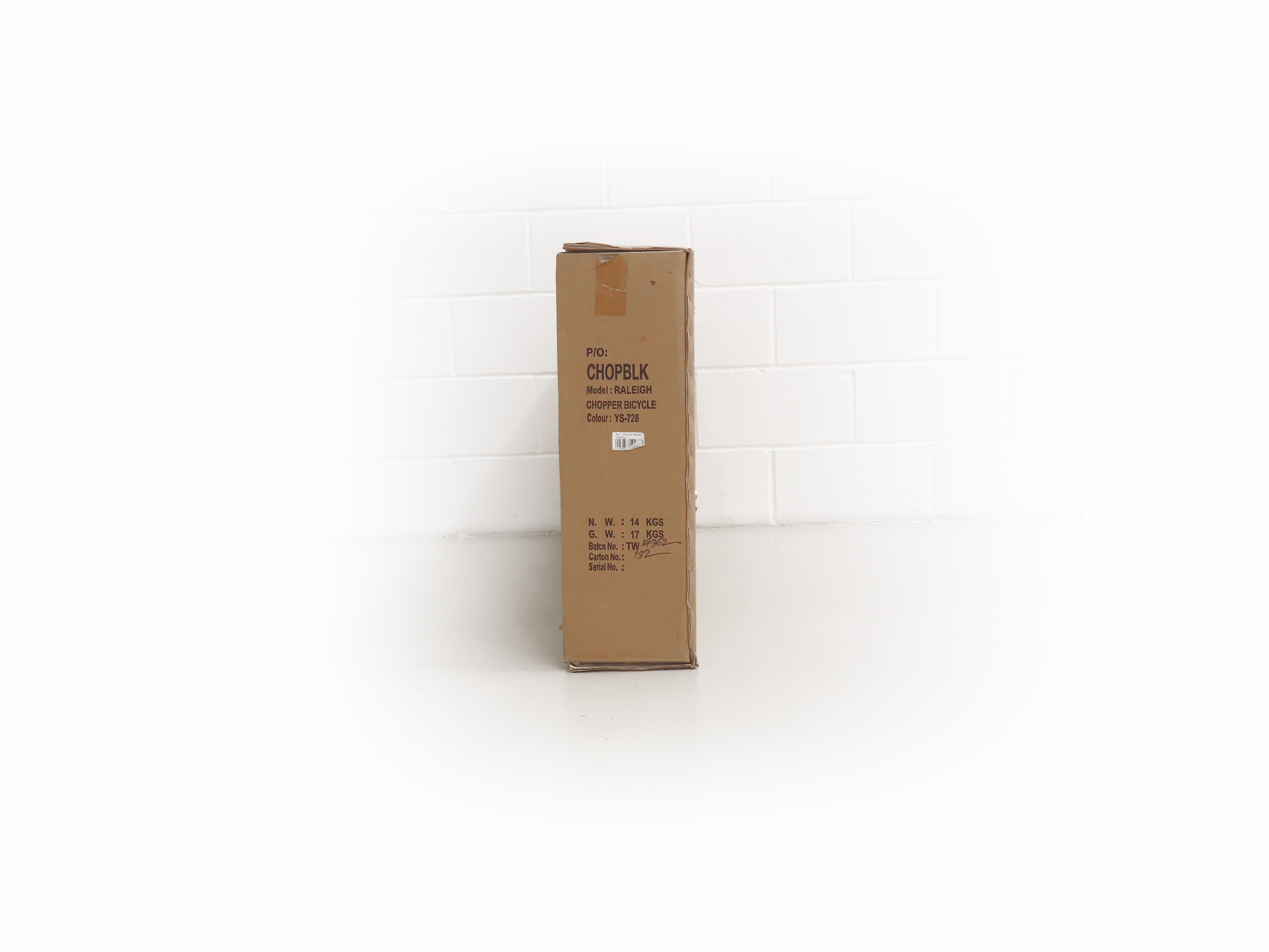 Still in its original factory box, this official UK rare Raleigh Chopper Black and Gold Limited Edition is a desirable item for Chopper fans all over the world. The bike has never been built remaining packaged, unassembled and with all protective wrapping intact. The box has been opened and has incurred some damage.