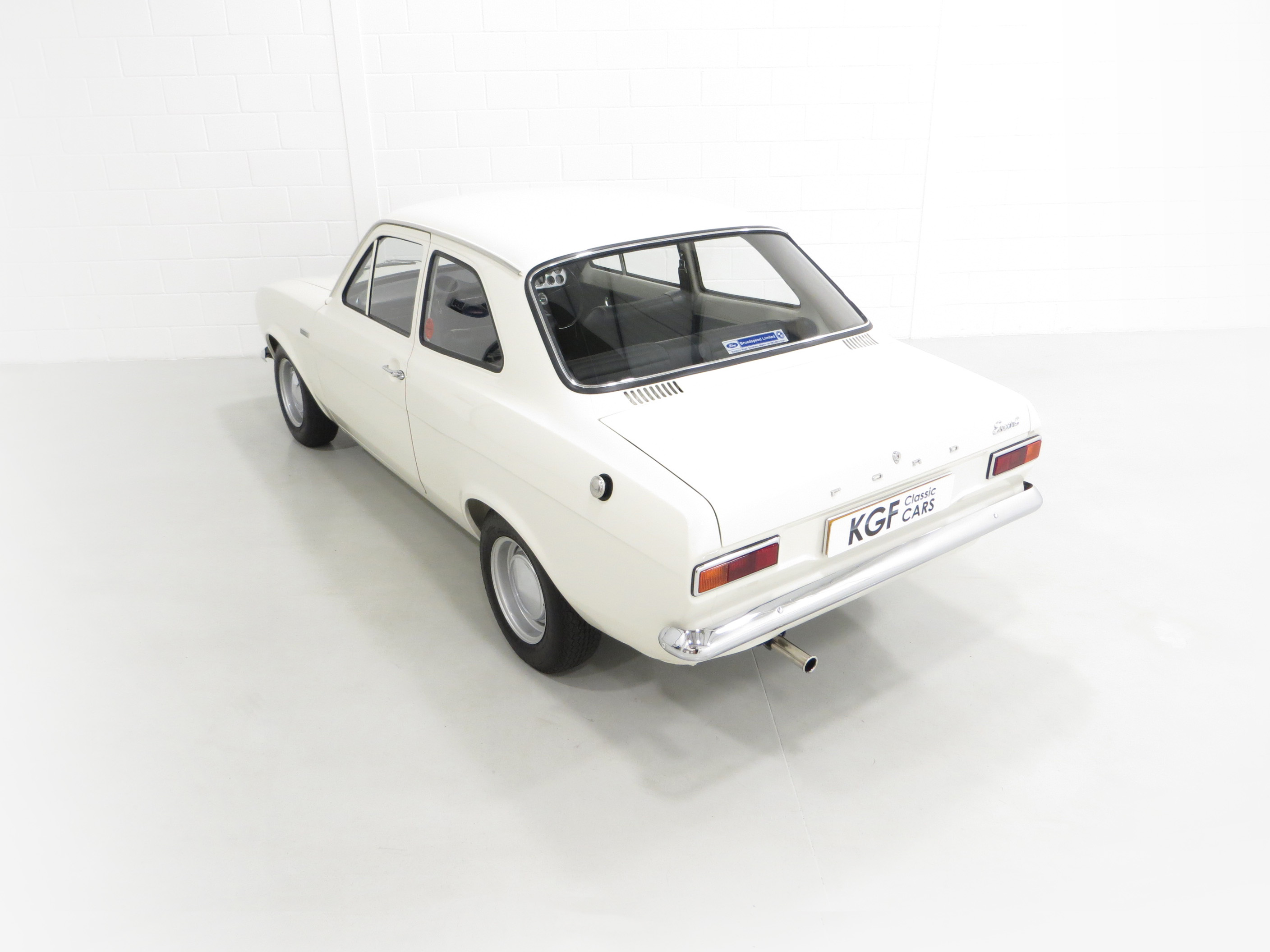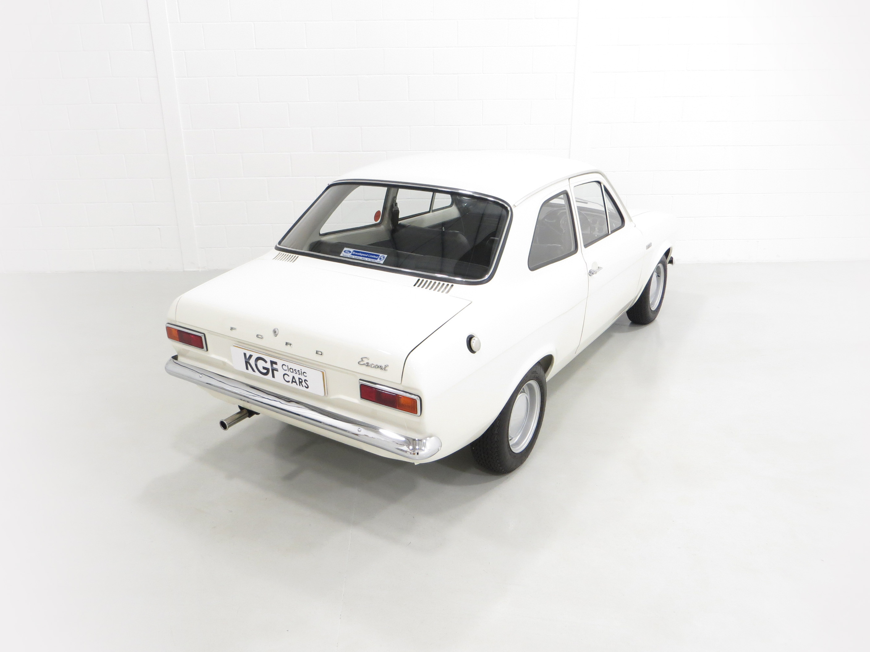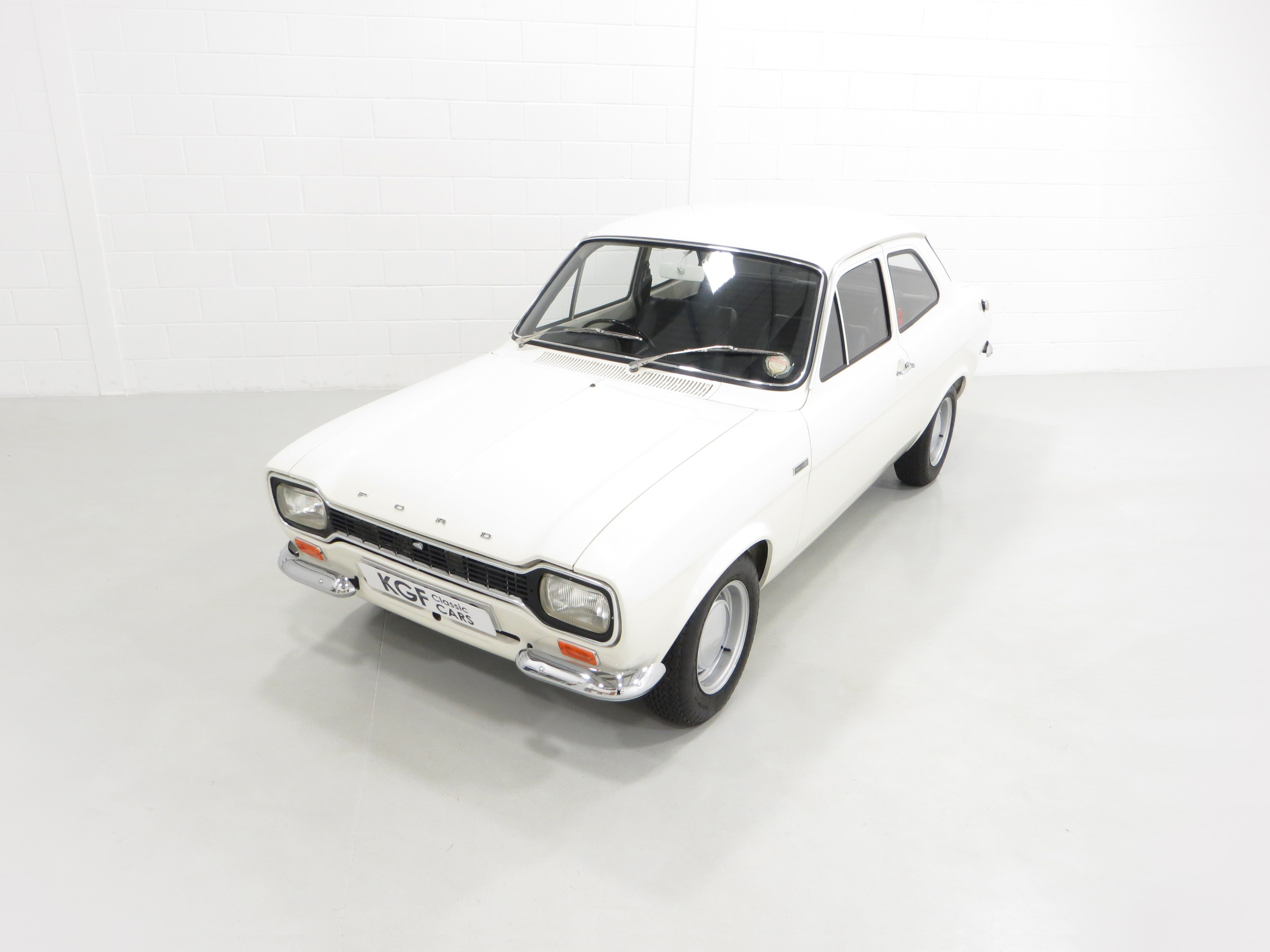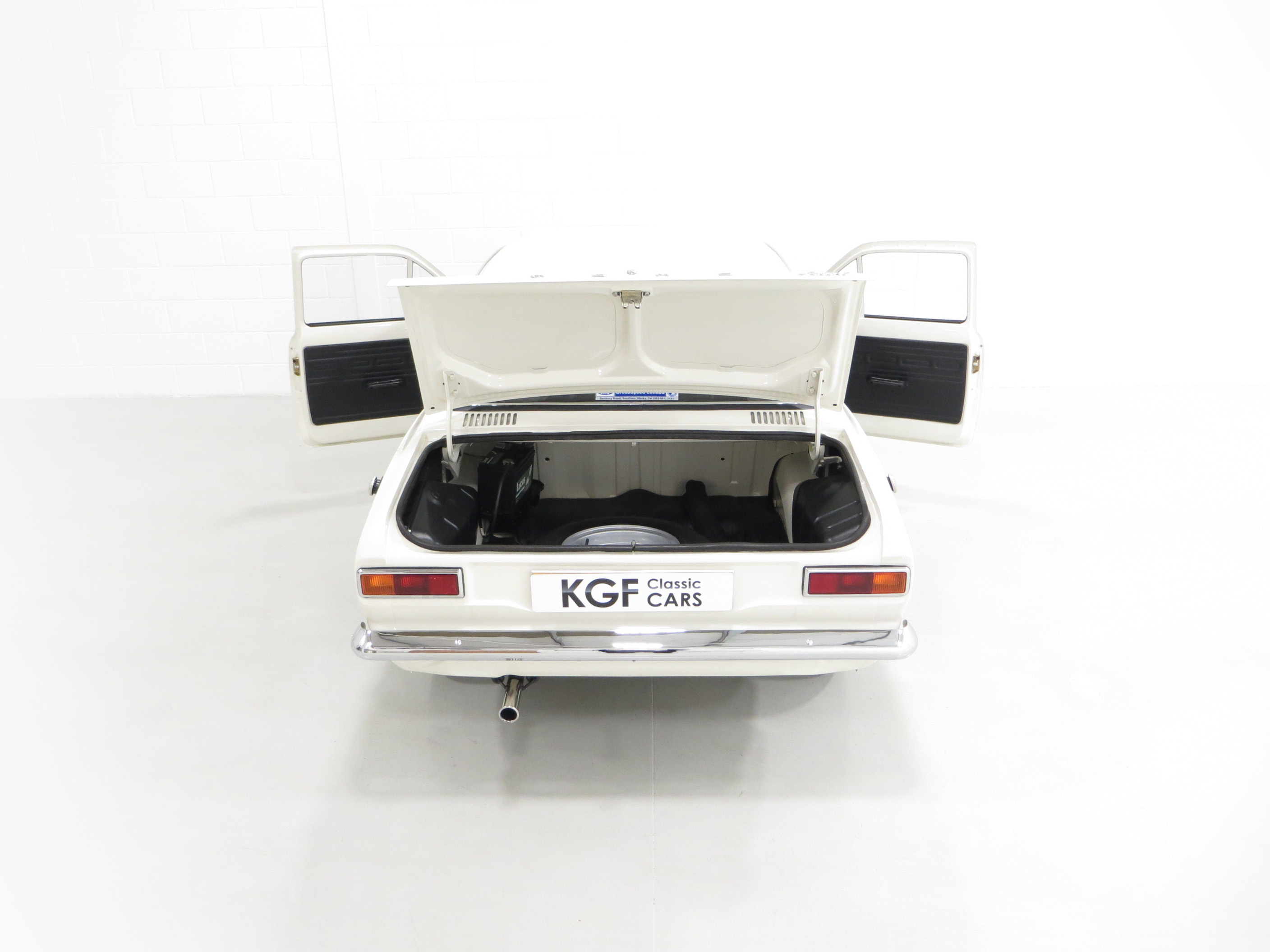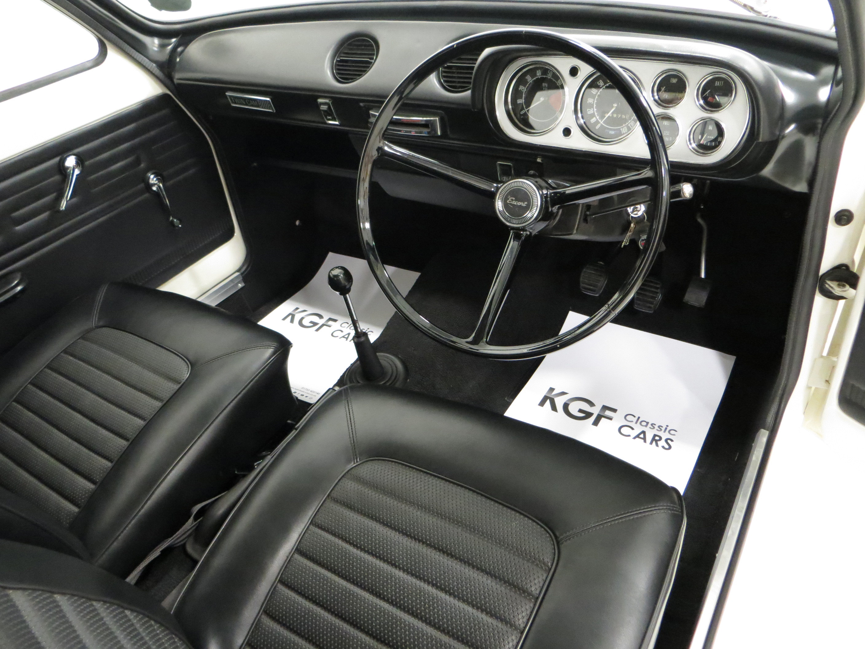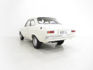 Simplicity and functional in every respect. An interior perfect to factory specification retaining virtually all original, date correct trim, instrumentation and switchgear. The heavy lateral fluting Black Vinyl, (Code D401), seats with push button controlled tipping are unmarked. The door cards are not reproduction and have the early padded block type stitched effect design, even the carpet is the original six-piece set! All gauges operate including the 140mph speedometer and 8,000rpm rev counter, within the satin chrome finished binnacle requiring calibration. The small metal Ford oval is fitted to the inner passenger-side doorstep. The pristine boot area houses the floor mounted spare wheel on top of the Hardura boot mat, car battery, jack and wheel brace in the fawn muslin bag and a very rare Rally Equipment option, an auxiliary touring fuel tank an extra 9 gallons of fuel, doubling the escort fuel capacity. Perfect in every way.