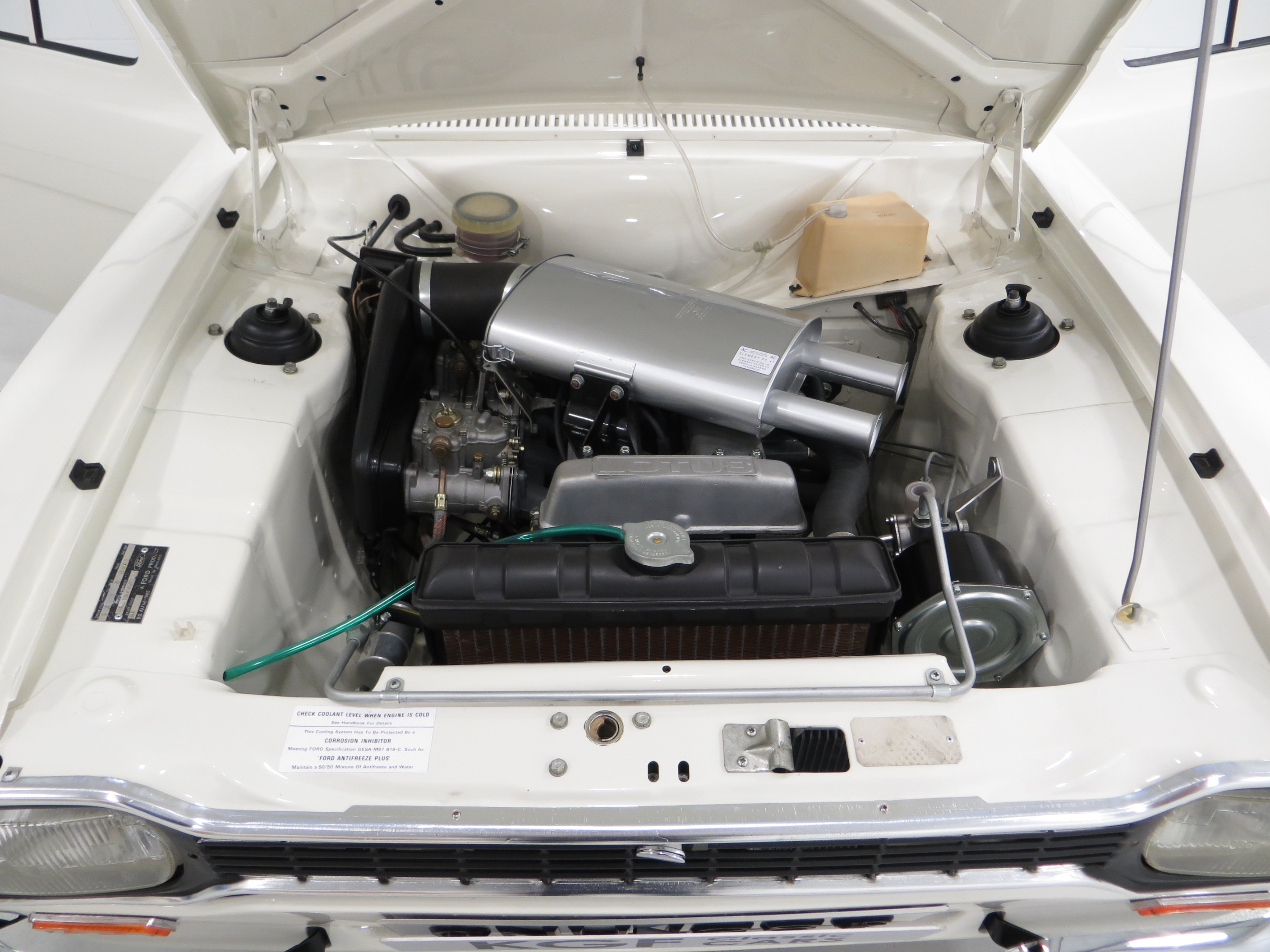 Taken directly from the Lotus Cortina Mk2, the chain driven DOHC 1558cc engine built by Lotus at Hethel, near Norwich produces 109.5bhp. Lifting the bonnet reveals why these cars are so special with the power plant tilted at an angle to fit and a host of modifications unique to the Twin Cam and to get everything into place. Correct features are seen everywhere from the engine stabiliser bar unique to the Twin Cam and plenum drain on the bulkhead to the cheese wedge washer bottle and three-eared oil cap. A reassuring sight is the original AVO plate or colour plate and chassis plate, not reproduction items. The suspension top plate also has the chassis number visible. A Ford Type-3 four-speed gearbox with three-rail shift mechanism and remote change, also known as the 2000E box, offers precise crisp changes and the hydraulic clutch is light with the correct combined brake/clutch master cylinder mounted in the engine bay.