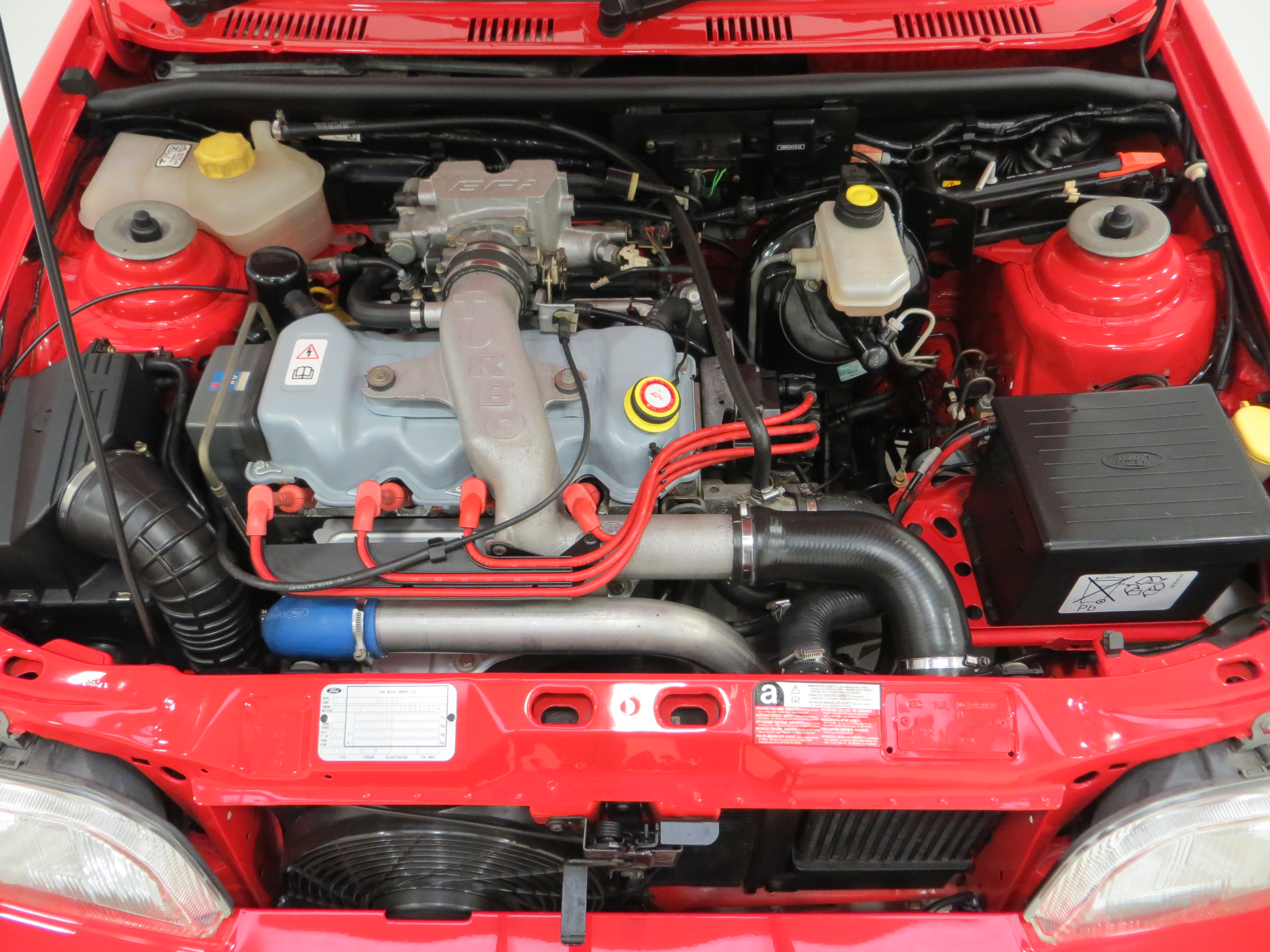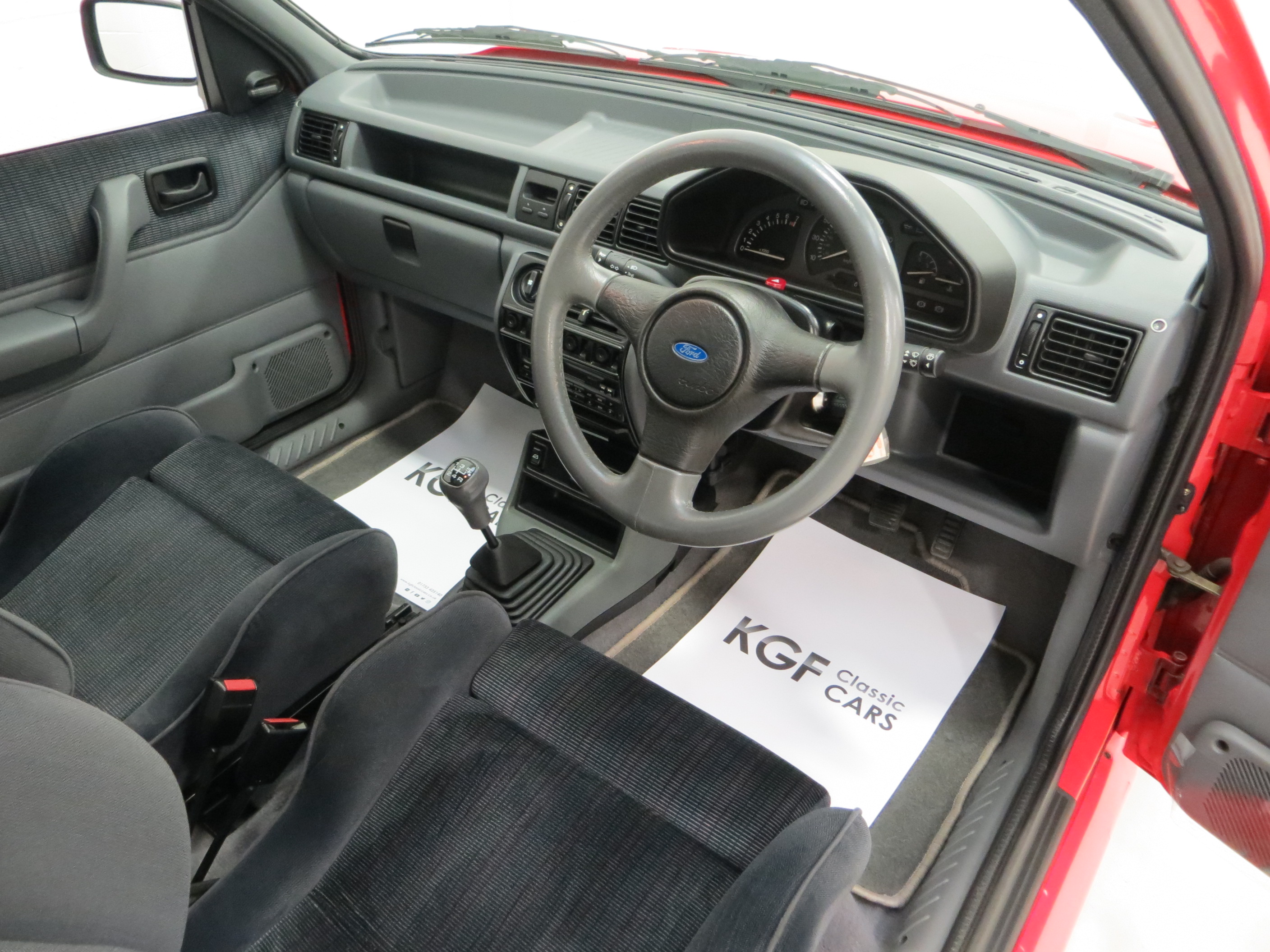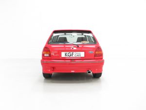 The 1.6 OHC fuel injected engine with Garrett AiResearch T2 turbo charger and intercooler produces 131bhp and 183Nm of torque. Figures quoted at 7.7 seconds to 60mph and a top speed of 127mph make this a true ‘hot hatch’. The engine bay is simply incredible with all the Ford labels, stickers and Ford stamps on the hoses. The often misplaced plastic battery cover remains fitted and the blue strut top factory markings are clearly visible. The 5-speed transmission works seamlessly with a progressive clutch action and short shift.