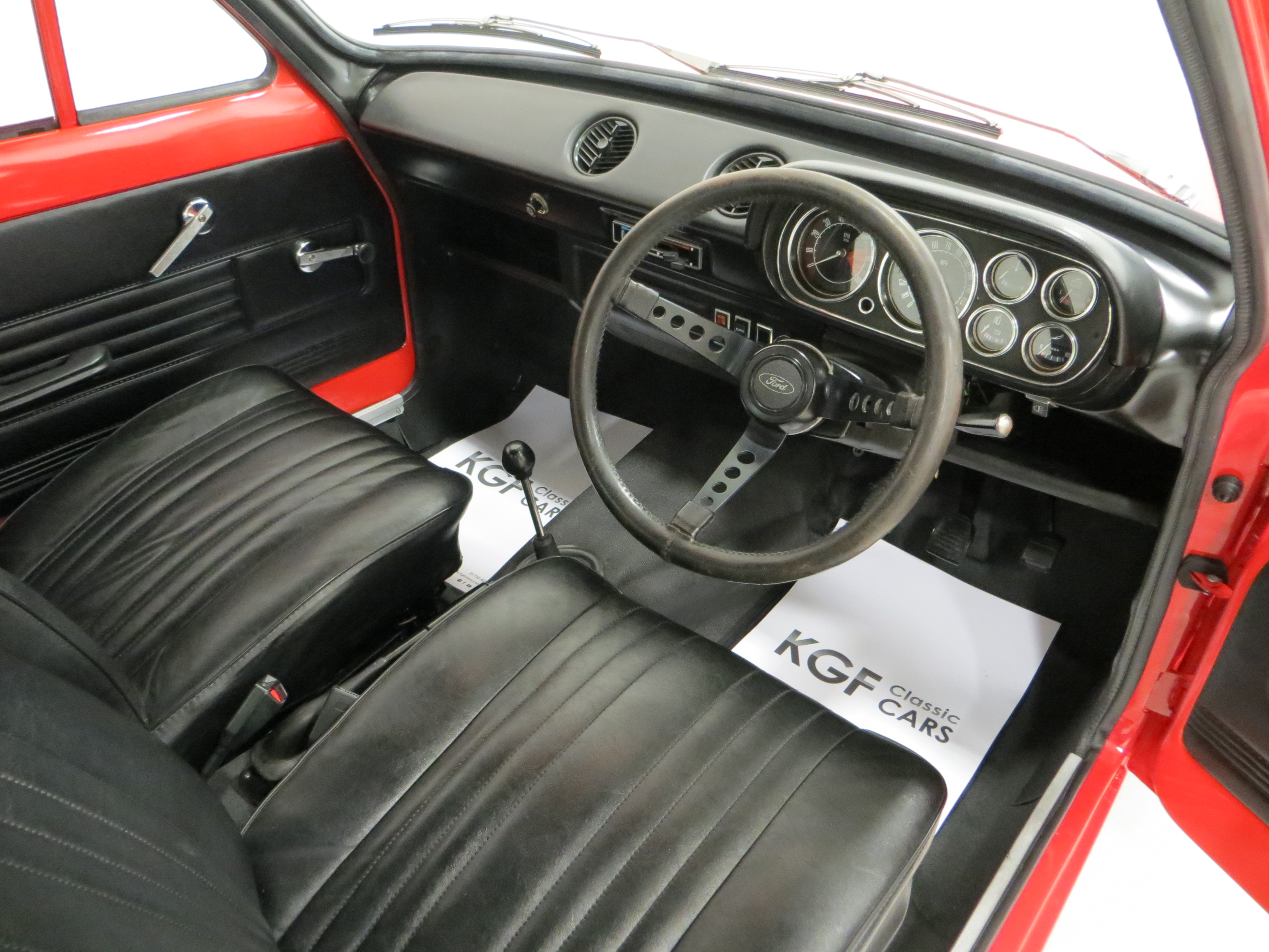 Finished in the correct and early colour of Sunset Red, (Code J), with contrasting white broad Mexico stripes, this iconic car looks tremendous. A bright uniform shine with vital components such as strengthened AVO workmanship are all present to see. The chrome, glass, and 1600GT badges are in excellent order. Early car features such as the starting handle hole with the black rubber grommet and straight chrome bumper are all correct and the underside is spotlessly clean in body colour for those enjoying the show scene. Genuine FoMoCo rear lenses and front indicator lenses are fitted and the front headlights have been upgraded. Detailed items such as the twin-wire Trico Speedblade wipers and petrol cap matched in stripe colour are correct features. A charming, genuine and very presentable Mexico ready for the next rally superhero!