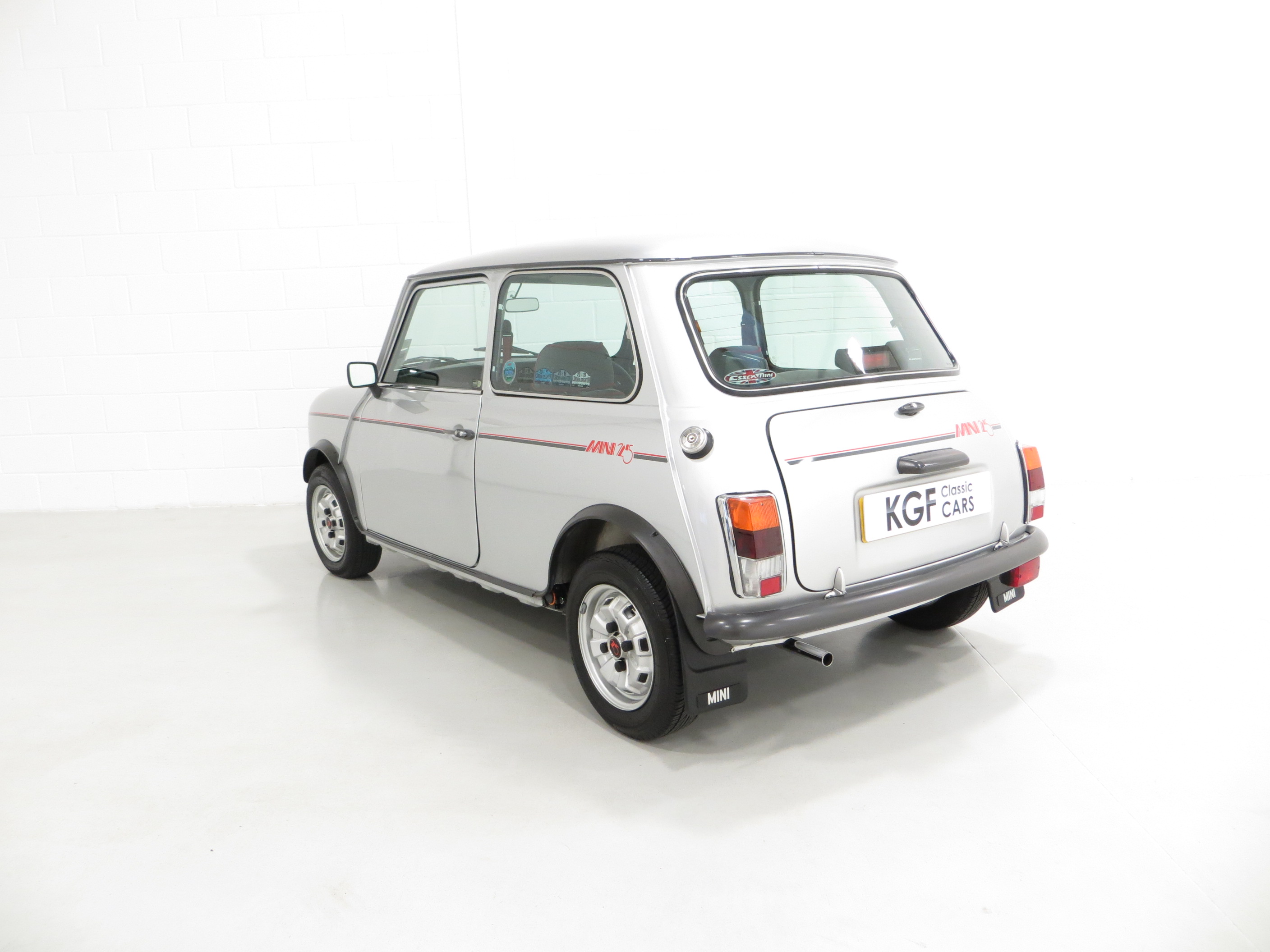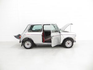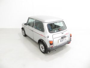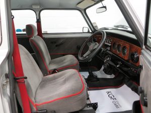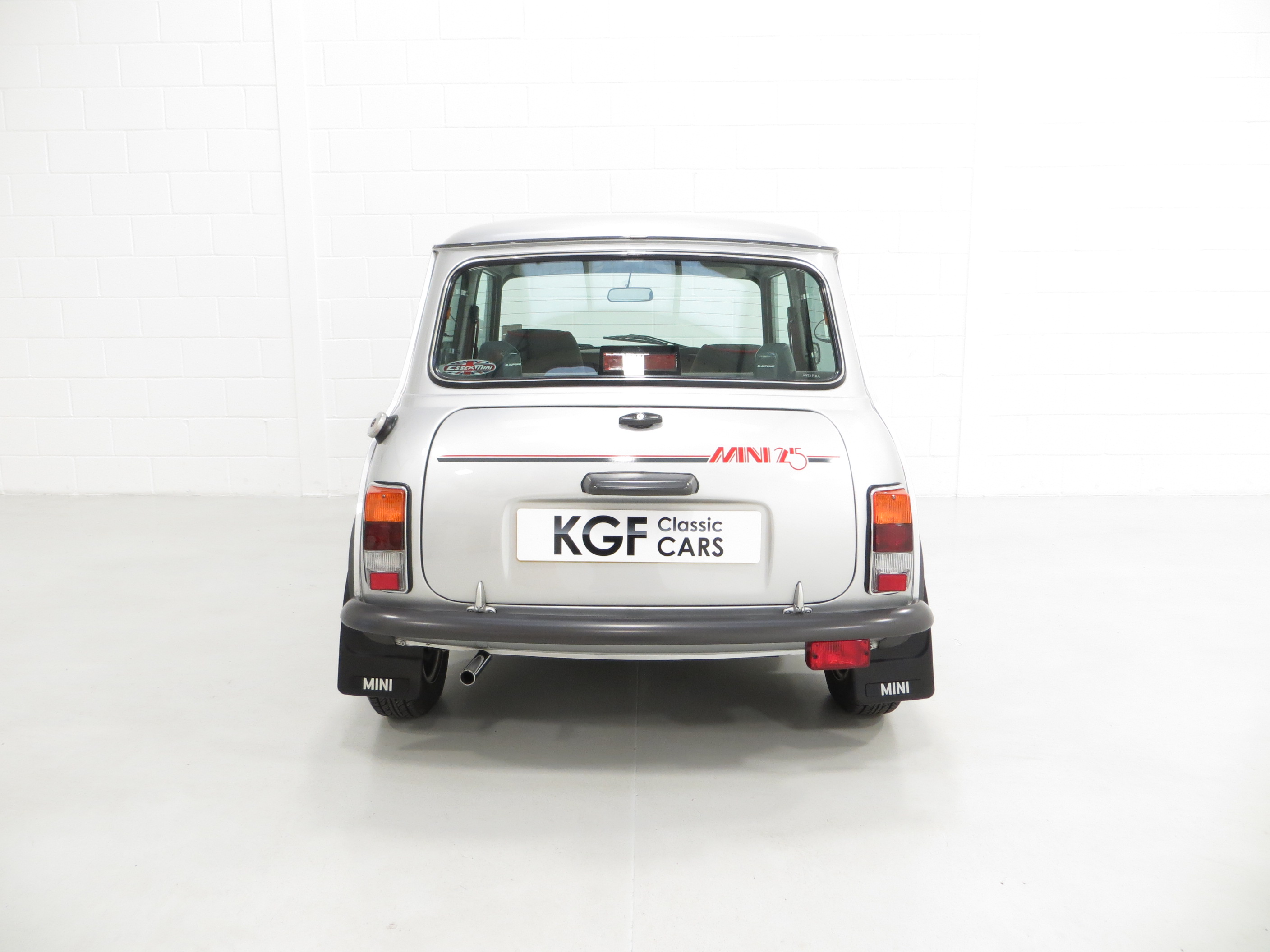 Laminated windscreen, tinted glass, twin exterior door mirrors, locking fuel filler cap, twin sun visors with vanity mirror, water temperature gauge, heated rear window, rear fog lamp, brake circuit test switch, front ashtray, twin door bins, rear companion boxes. Special Edition Mini 25 Features; Silver Leaf clearcoat paintwork, Grey Nimbus finish to Bumpers, grille, wheel arch extensions, door handles, roof and sill finishers. Grey/red side and bootlid tape with integral ‘Mini 25’ decal, Flint velvet knitted fabric seats and trim with ‘25’ motif, red velvet seat piping, unique seat front pockets, leather-bound steering wheel with ‘25’ motif, red seatbelt webbing, red piped floor mats. Dealer accessories; TOAD alarm, mud flaps, walnut dashboard incorporating additional gauges.