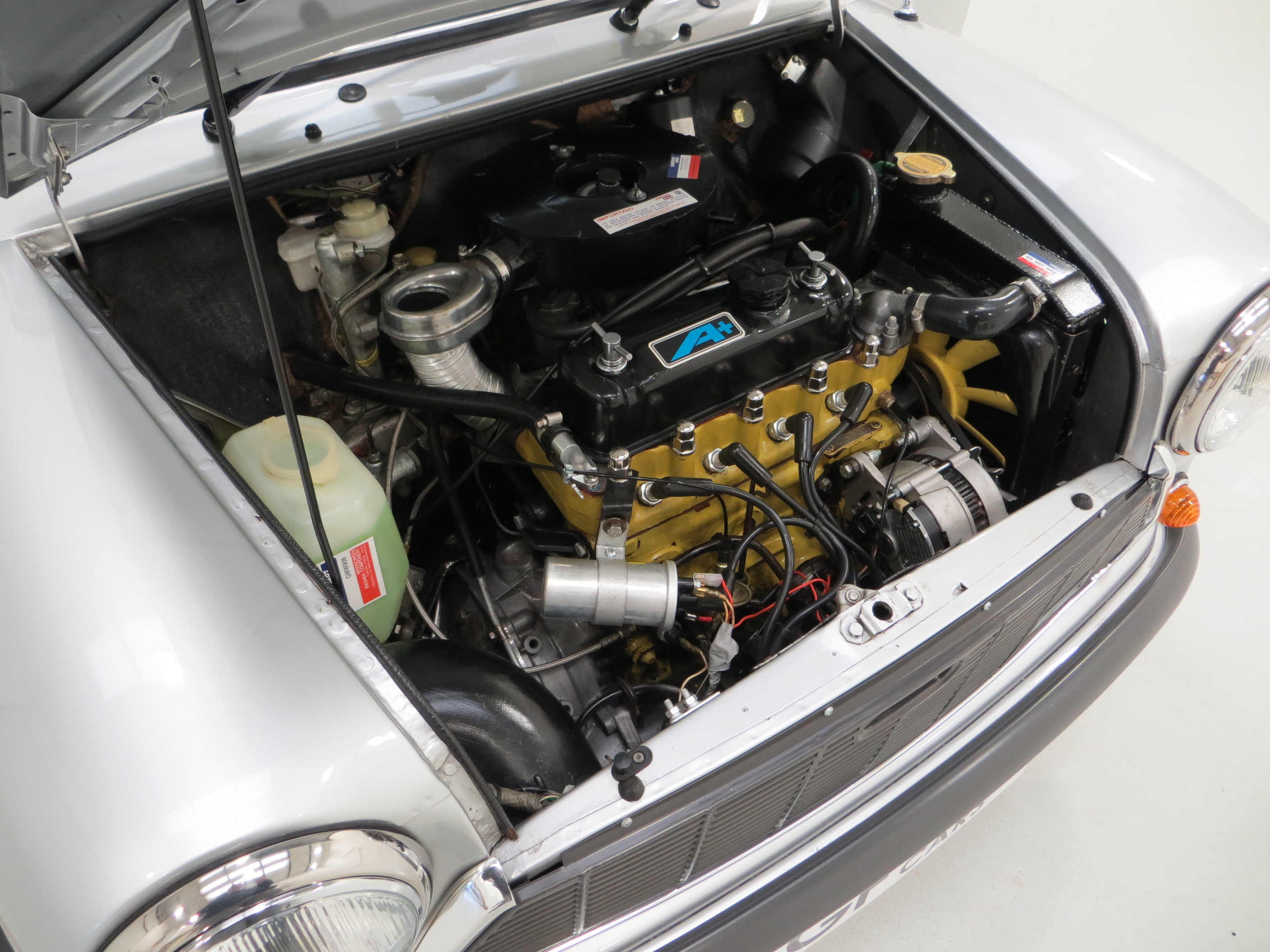 Needing little introduction, the engine is the 4-cylinder transverse OHV 998cc A+ unit with developing a lively 40bhp. The engine pulls strongly and quietly and ultra-simplicity coupled with excellent parts availability ensures low running costs and excellent reliability, the mantra for every Mini made! The beautifully detailed engine bay with factory plates and stickers intact is finished in the correct yellow for the block to denote 998cc in size. A manual cabin switch-operated electric fan has been fitted as an upgrade. The four speed all synchromesh gearbox is smooth and light with precise gear changes accomplished effortlessly. Huge fun that can only be found with a classic Mini!